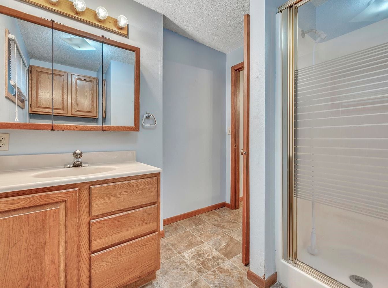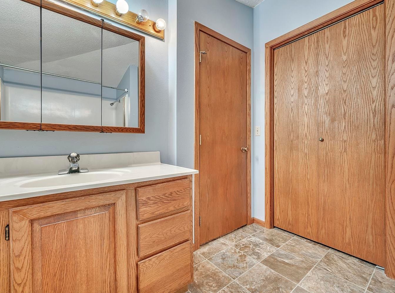 This bathroom features a clean and functional layout with a light blue wall color that enhances openness. A double-door wooden cabinet provides ample storage, crafted from warm oak that complements the bathroom’s aesthetic. The white countertop is sleek and minimalist, adorned with a polished chrome faucet, reflecting modern simplicity. A large rectangular mirror above the sink accentuates natural light, while a light fixture with exposed bulbs adds a vintage touch. The flooring combines shades of gray and brown, offering a neutral base that harmonizes with the wooden elements, creating a welcoming and warm ambiance.