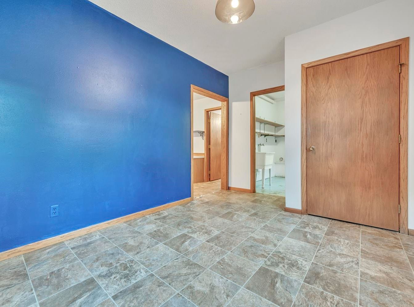 This utility room features a bold blue accent wall that adds vibrancy to the space. The flooring consists of large, textured tiles in neutral beige and gray tones, providing a modern contrast. Wooden trim surrounds the doorway, showcasing warm oak finishes. To the right, a wooden door leads to another room, while a doorway ahead opens to a small area with shelves and a sink. The light fixture above offers ample illumination, enhancing the clean lines and simplicity of the design. The overall layout conveys functionality, making it an efficient working space.