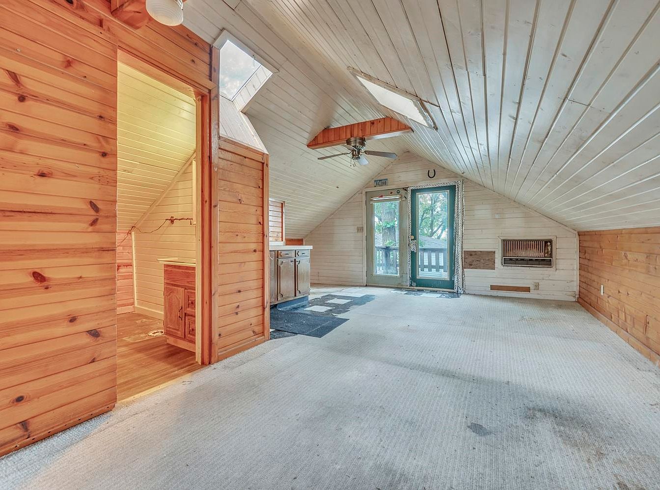 This attic area features a sloped ceiling with wooden paneling that creates an inviting, rustic atmosphere. Natural light floods in through two skylights and a set of double doors leading to a small balcony, enhancing the airy feel. The wooden walls, primarily in warm tones, contrast with the lighter painted ceiling, promoting a cozy ambiance. An unfinished section showcases a wood vanity and plumbing, indicating potential for a bathroom or utility area. The flooring is currently carpeted, showing signs of wear, while the space remains open, allowing for versatile design possibilities.