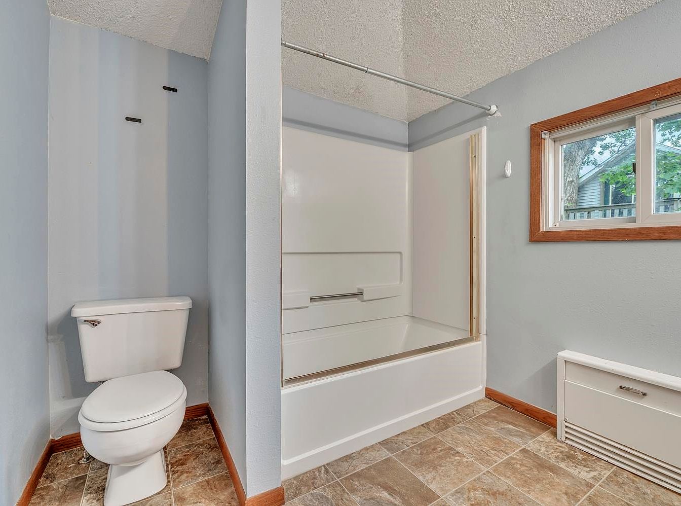 This bathroom showcases a practical layout with a clean design. Light blue walls create a soothing ambiance, enhanced by natural light filtering through the window with wooden framing. The bathtub, with a sleek white finish, features a safety rail, while the surrounding tile floor adds a textured contrast. A positioned toilet adds to the efficient space usage, complemented by a baseboard heater beneath the window. The simplicity of the design invites a refreshing atmosphere, combining functionality with understated elegance. Minimal decor, such as hooks on the wall, maintains the uncluttered feel, ensuring it remains functional and inviting.