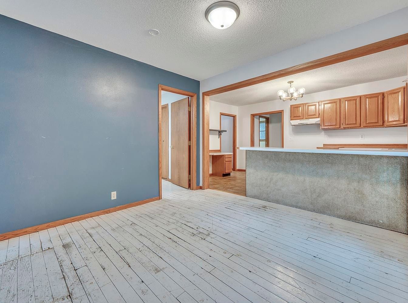 The space features a blend of rustic and modern elements, highlighted by a rich blue accent wall. Beneath, the whitewashed wooden floor showcases a weathered texture, adding character. An open doorway leads into a well-lit kitchen area equipped with wooden cabinetry that offers warmth against the light walls. A central island creates a natural flow, while the overhead light fixture enhances the cozy ambience. The room’s layout emphasizes openness, promoting a welcoming environment perfect for gatherings. Doorways on either side invite movement, seamlessly connecting this dining area to adjacent spaces.