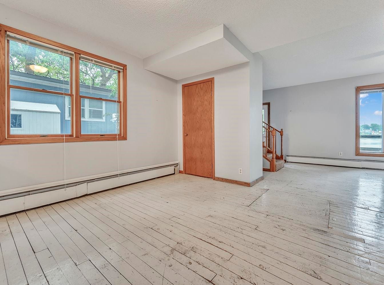 A spacious living room features light gray walls, which enhance the bright atmosphere. Natural light streams through two large wooden-framed windows, illuminating the weathered white wooden floor. The ceiling is simple, providing an unadorned, airy feel. A wooden door sits on one wall, leading to adjacent spaces. The room’s layout is open, seamlessly connecting to a staircase in the corner, adding architectural interest. The exposed heating unit along the wall suggests functionality intertwined with design. Overall, the combination of warm wood accents and neutral tones creates a welcoming and versatile environment.