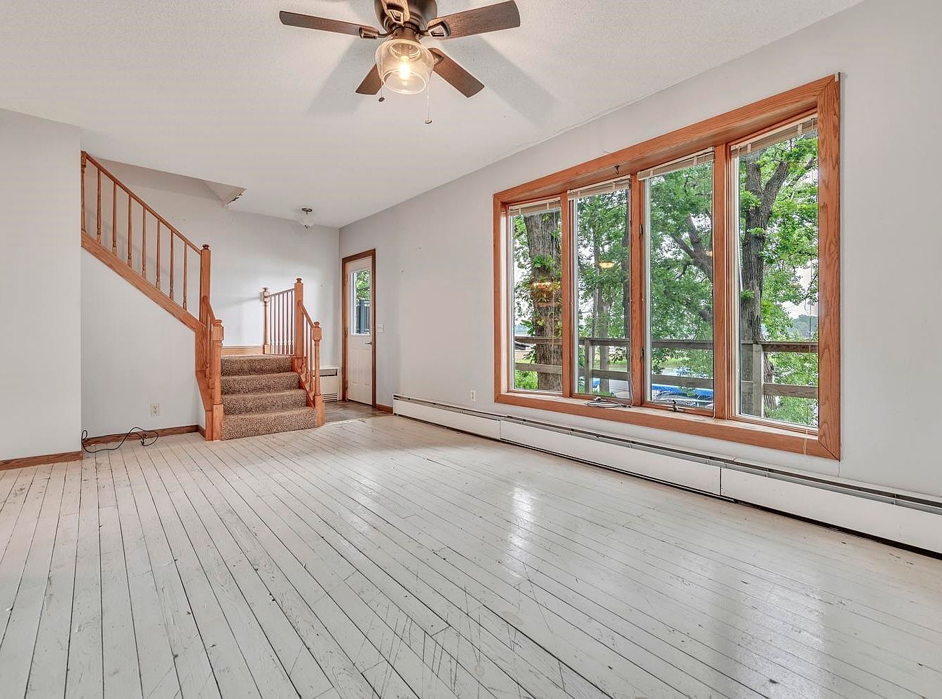 This living room features a bright and airy atmosphere accentuated by large, multi-pane windows framed in warm wood. A spacious layout with pale wood flooring provides a rustic yet modern feel. Adjacent to the windows, a staircase with wooden railings leads to an upper level, creating a welcoming entrance. The walls are painted in soft neutral tones, enhancing the light from the windows. A ceiling fan adds a cozy touch, while the natural light highlights the home’s architectural charm. Overall, the space combines functional design with a refined aesthetic, perfect for relaxation or gatherings.