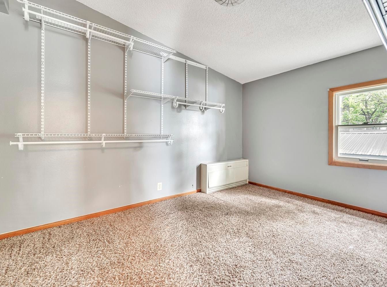 This spare room features a minimalist design with a neutral palette of light gray walls, creating an airy atmosphere. The carpet is plush, offering comfort underfoot. On one wall, a metal shelving system provides ample storage, perfect for organizing personal items. A discreet heating unit sits beneath a window that allows natural light to spill into the space, illuminating the room. The window frame is wooden, adding warmth to the cool color scheme. The overall layout is functional, focusing on practical use, making it an inviting area for various activities or for use as a small office.