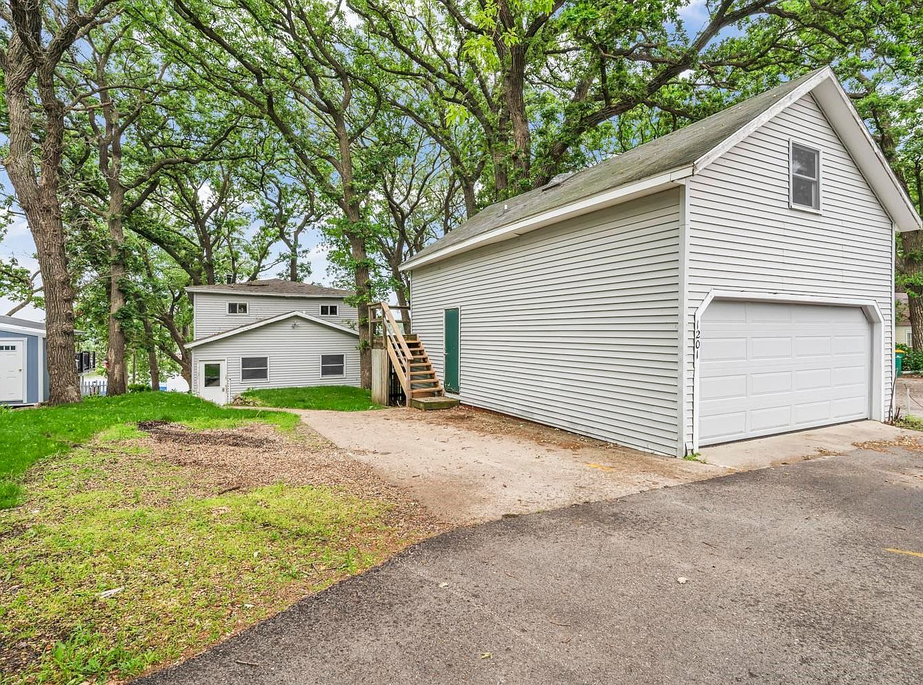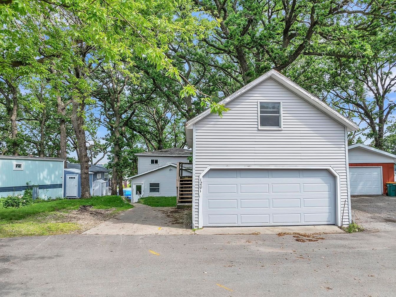 The residence showcases a charming exterior with a well-maintained white siding and a sloped roof that adds character. A prominent garage door, painted in a light gray, emphasizes functionality. The driveway is spacious, potentially accommodating multiple vehicles, flanked by a lush green lawn that enhances the overall curb appeal. Towering, vibrant trees provide natural shade, creating a serene atmosphere. Adjacent structures hint at a cozy neighborhood, while visible wooden steps lead to an entry point, suggesting welcoming accessibility. This blend of nature and structured space reflects a harmonious suburban aesthetic.