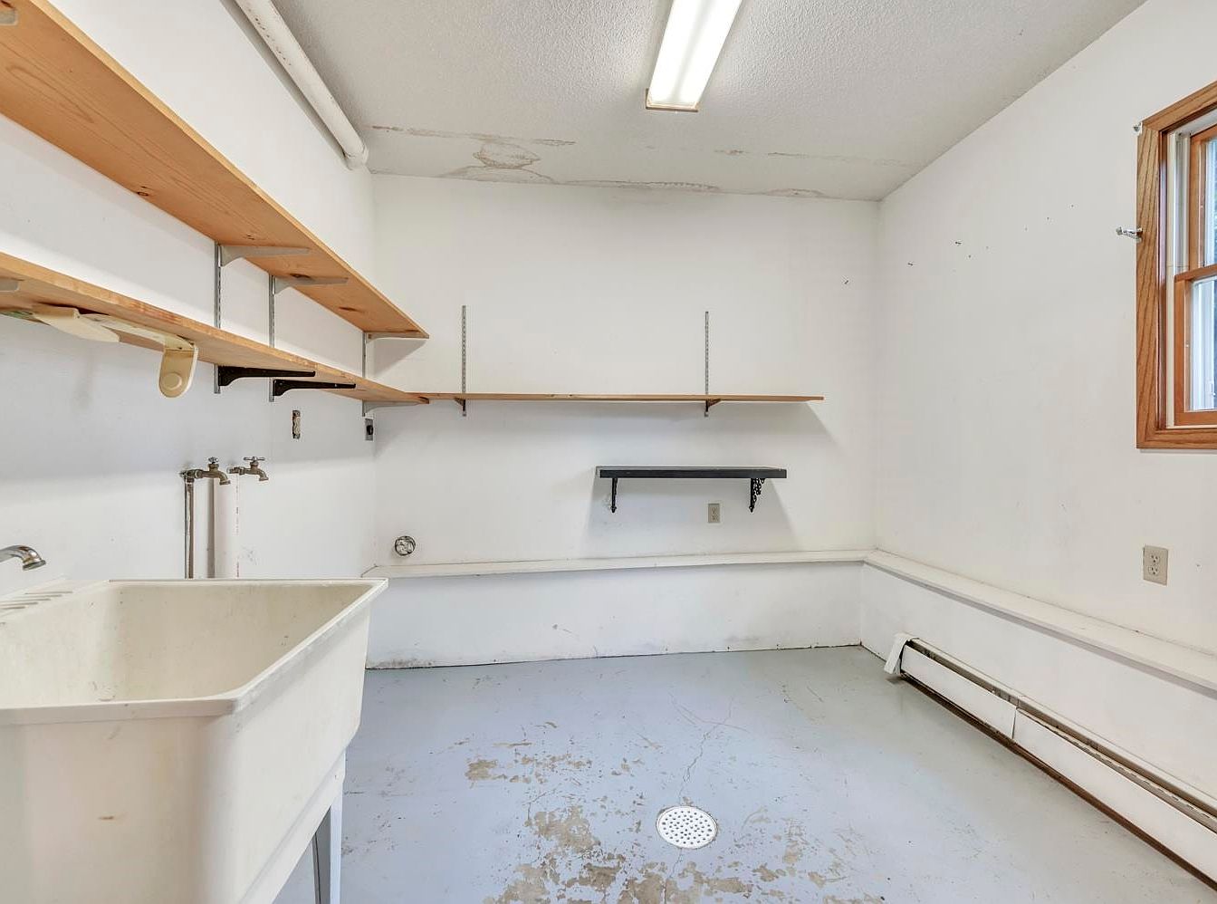 A practical and utilitarian laundry room featuring a simple layout. The space includes a large, white laundry sink positioned against the left wall, complemented by exposed plumbing. Above, wooden shelves provide ample storage for laundry supplies, varying in height. The walls are painted a plain white, enhancing the sense of openness, while the gray floor displays signs of wear. A small window, adorned with wooden trim, allows natural light to penetrate the room, illuminating its functional design. Minimalist in nature, the room prioritizes efficiency and utility over decorative elements, focusing on the needs of a busy household.