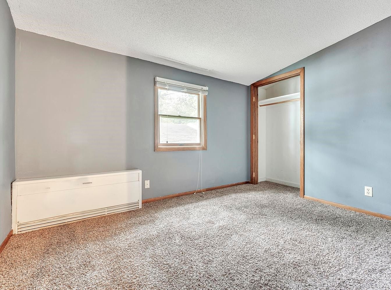 This is a cozy bedroom featuring a soft color palette, primarily light blue walls that create a calming atmosphere. The room has plush, neutral-toned carpeting that adds warmth underfoot. Natural light pours in through a medium-sized window adorned with simple blinds, illuminating the space. A stylish baseboard heater is installed along the wall, offering comfort during cooler months. To the right, a doorway leads to a built-in closet with white doors, providing ample storage. The overall design combines functionality with a serene aesthetic, making it a perfect retreat for relaxation and rest.