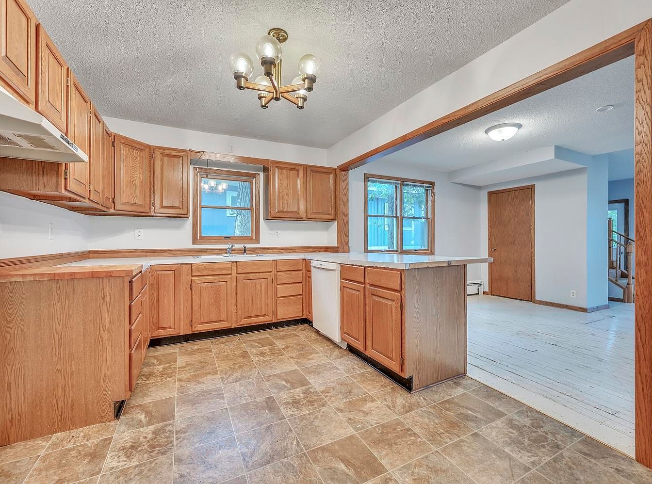 The kitchen features a functional layout with honey-toned wooden cabinetry that extends along two walls, providing ample storage. A central island countertop offers additional workspace, enhancing the kitchen’s utility. A warm, neutral tile floor complements the wooden elements, creating an inviting atmosphere. Large windows allow natural light to flood in, illuminating the room and connecting it to the outdoors. The simple chandelier above adds a touch of elegance. The adjacent doorway leads into another room, hinting at an open-concept design. Overall, the combination of light colors and wood finishes evokes a cozy and welcoming environment.