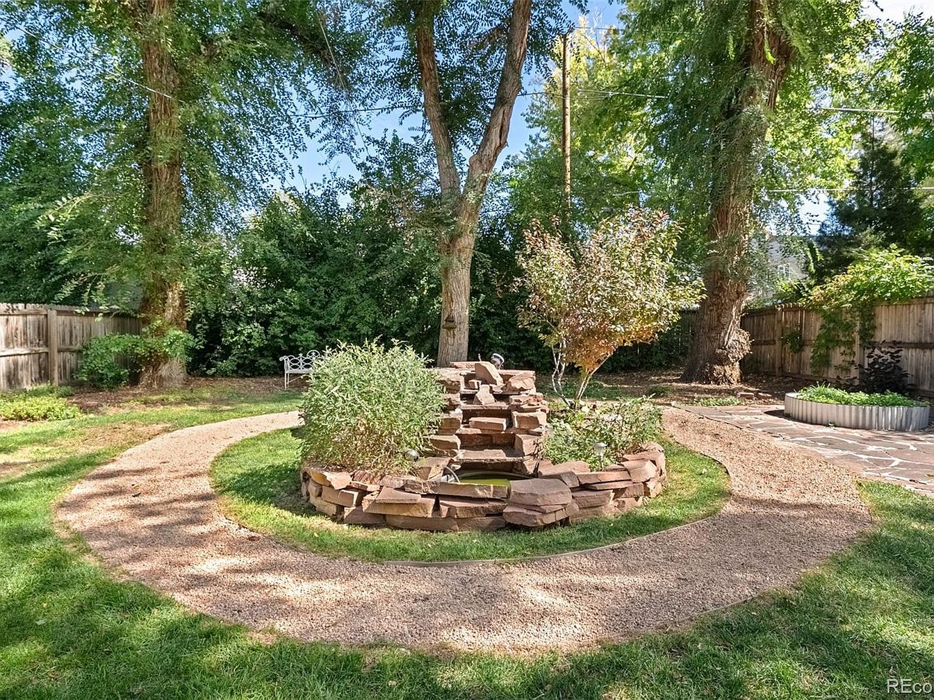 A curved gravel pathway encircles a central stone water feature, creating a focal point in the garden. Mature trees with abundant green foliage provide ample shade along the wooden fenced perimeter. A cluster of ornamental bushes and flowering plants surround the stone fountain, giving the area a lush, serene feel. A white metal bench sits in the background, inviting quiet reflection. To the right, a circular raised garden bed is filled with greenery and small shrubs, while a section of flagstone patio leads seamlessly from the house into the garden. Natural and earthy tones dominate the landscape, enhancing the historic charm.
