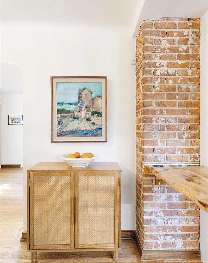 A sunlit corner featuring a natural wood and rattan cabinet, topped with a simple white bowl holding oranges. The background wall is painted a soft white, enhancing the light and open feel of the space. On the wall above the cabinet, a framed landscape painting adds a touch of color. To the right, a rough-textured exposed brick column introduces rustic character, with a live-edge wood shelf extending from it, blending warmth and natural materials. Light wood flooring continues the organic aesthetic, and a wide archway leads into an adjoining room visible in the background, suggesting an open layout.