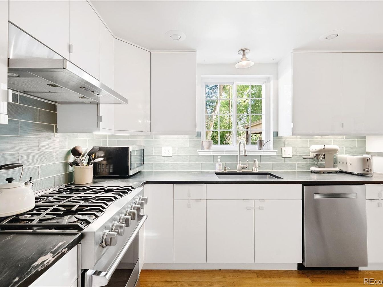 Bright, airy kitchen features sleek white cabinetry and glossy light-blue subway tile backsplash. Black marble-style countertops provide a dramatic contrast against the cabinetry, while modern stainless steel appliances, including a gas range, oven, and dishwasher, enhance the space’s contemporary vibe. A window above the sink lets in natural light and frames a view of leafy greenery outside. Minimalist hardware and fixtures, including a stylish gooseneck faucet and under-cabinet lighting, maintain a streamlined look. On the counters, a cream ceramic crock holds utensils next to a microwave, and a light-colored stand mixer and toaster add retro-chic charm to the right side.