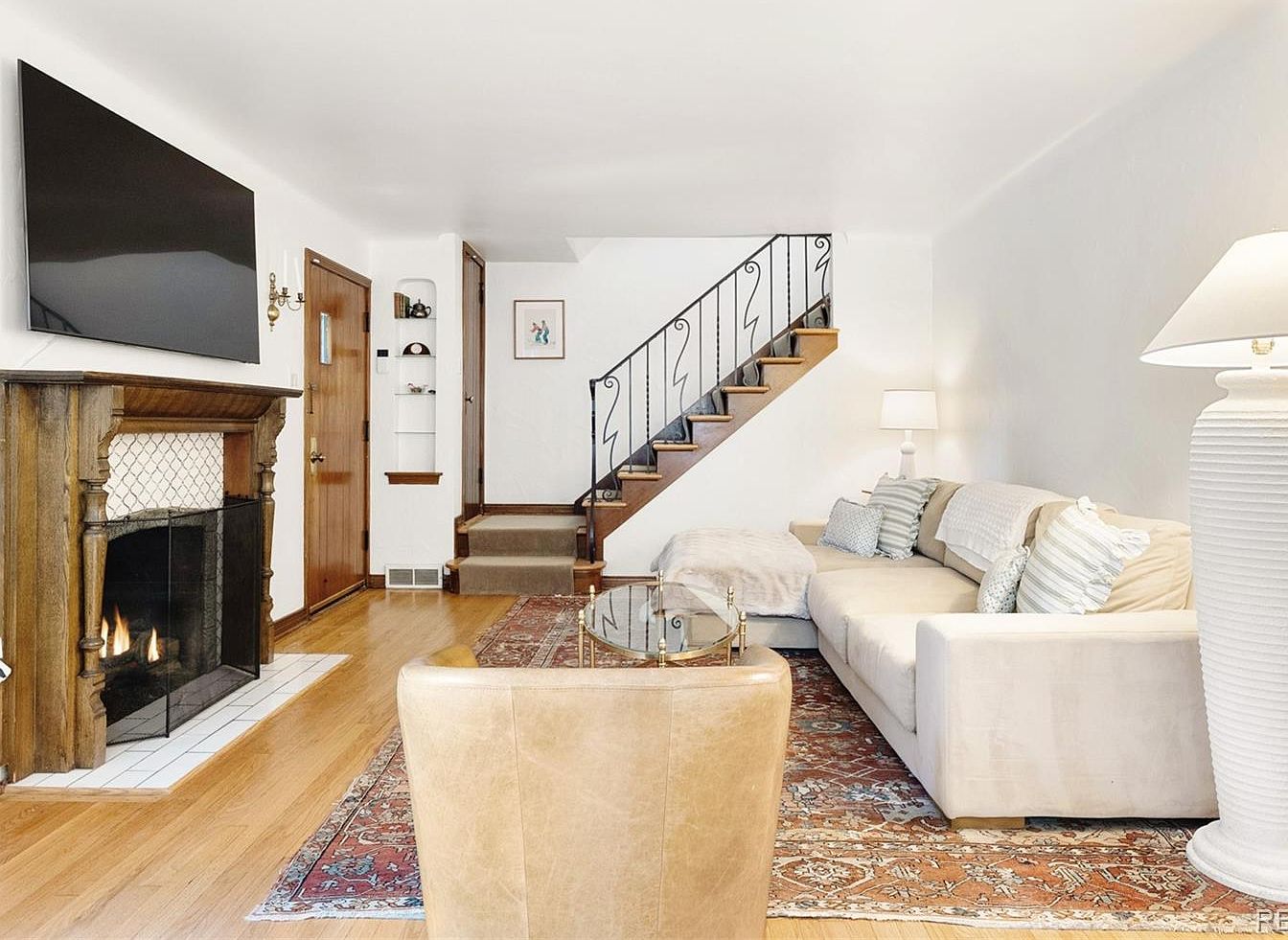 A spacious living room features light-colored wood floors and crisp white walls, creating an airy, inviting atmosphere. Against one wall stands a stone fireplace with a wooden mantel, above which is mounted a flat-screen television. To the left, a wooden front door opens into the room, accented by built-in shelving with decorative items. A classic iron staircase with wooden treads leads upstairs, positioned beside a cozy L-shaped cream sectional sofa adorned with plush, patterned pillows. The area is anchored by a richly patterned Persian-style rug, and both a sculptural table lamp and elegant side lamp contribute to the soft, warm lighting.