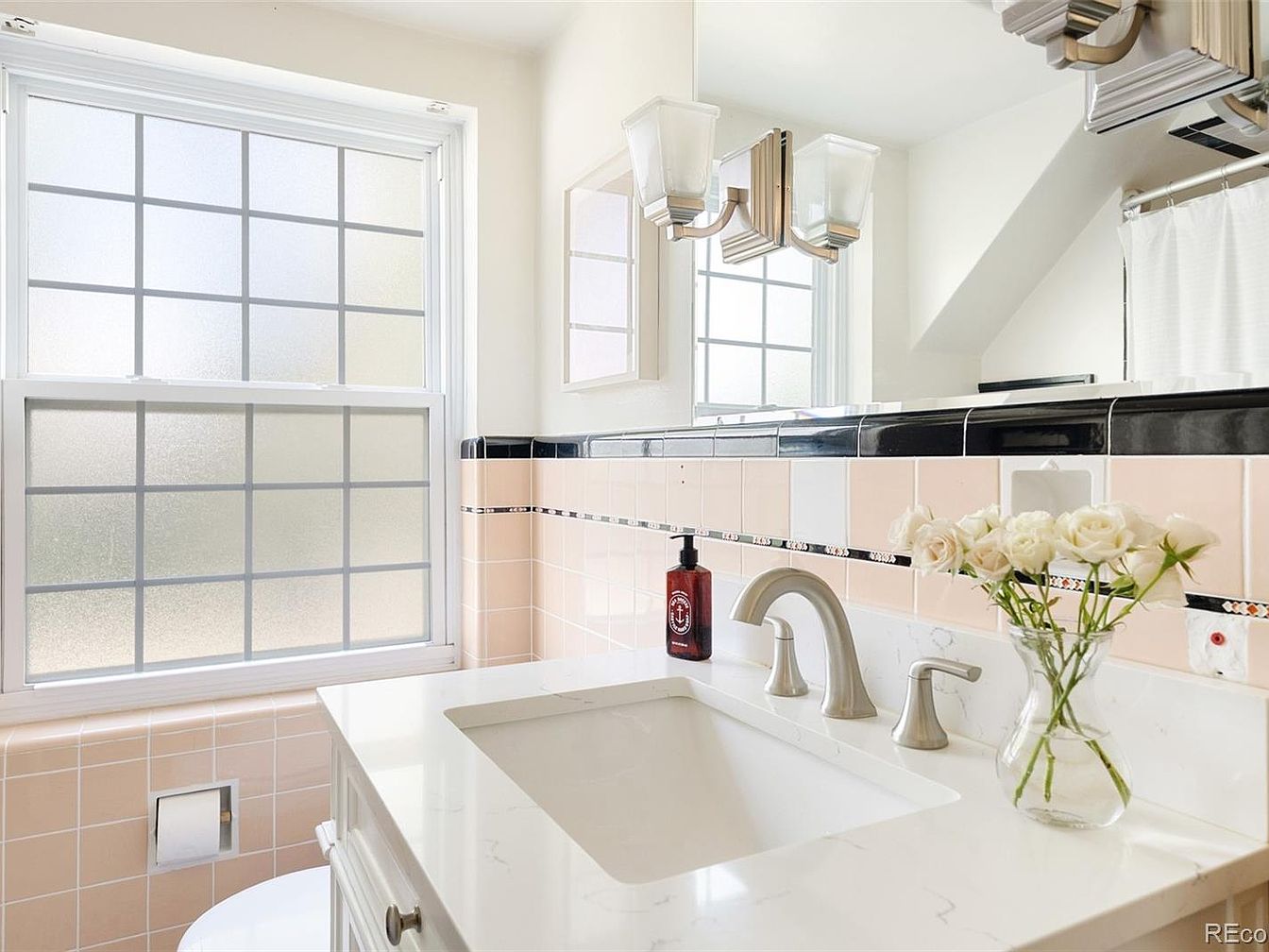 A bright, vintage-inspired bathroom featuring a large window with frosted glass panes that allow natural light to enter while ensuring privacy. The walls are adorned with retro pink tiles accented by black trim and decorative borders, creating a charming mid-century aesthetic. A white quartz countertop with an integrated rectangular sink sits atop a white vanity. The faucet and handles are brushed nickel, adding a modern touch. On the counter, a clear vase holds fresh white roses, bringing a gentle elegance to the space. Above the sink, stylish dual sconces and a mirrored cabinet contribute to the room’s clean, welcoming feel.