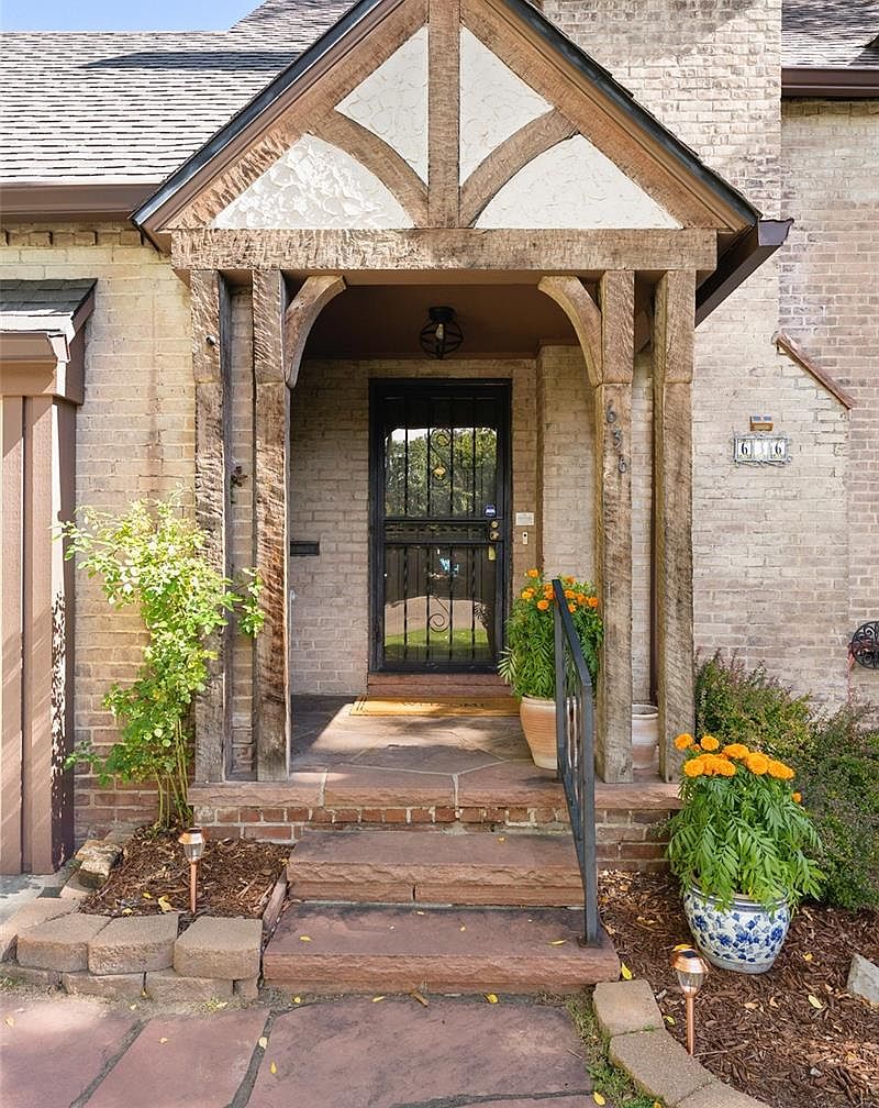 A quaint covered entryway features rustic wooden beams accentuating the gabled roof and Tudor-style half-timber details. The brick façade is a light tan, complemented by the reddish-brown stone steps leading up to the black metal front door. Two large potted plants overflowing with vibrant orange marigolds frame the small porch, adding a lively burst of color. Low garden lights and green foliage soften the pathway, while the textured stucco under the gable and the classic lantern light fixture under the porch lend historic character and curb appeal to this inviting front entrance.