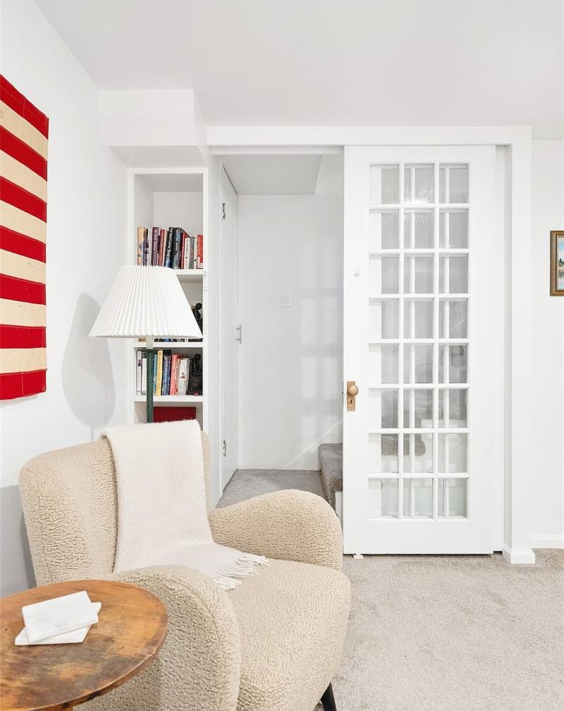 A cozy reading nook featuring a plush, textured armchair draped with a cream-colored throw sits beside a round wooden side table with a folded cloth resting on top. Adjacent to the chair, a white built-in bookcase with shelves neatly lined with books enhances the inviting atmosphere. A tall white lamp with a pleated shade provides light for reading. The walls and ceiling are painted bright white, contributing to a clean, airy feel. A sliding French door with glass panes and brass hardware opens to a carpeted hallway. A bold red-and-beige striped wall hanging adds a pop of color to the serene space.