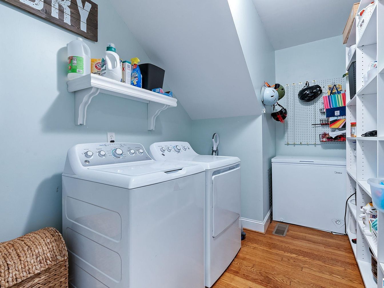 The laundry room features modern white appliances, including a washer and dryer, positioned against a soft blue wall, enhancing a clean and airy ambiance. Above the machines is a white shelf displaying various cleaning supplies, maintaining an organized look. A natural woven basket adds warmth and functionality. To the right, a freezer sits alongside a pegboard, neatly arranged with colorful markers, helmets, and tools, showcasing practical storage solutions. The space incorporates oak flooring, providing a warm contrast to the cool tones of the walls, creating a comfortable and welcoming atmosphere suitable for laundry tasks.