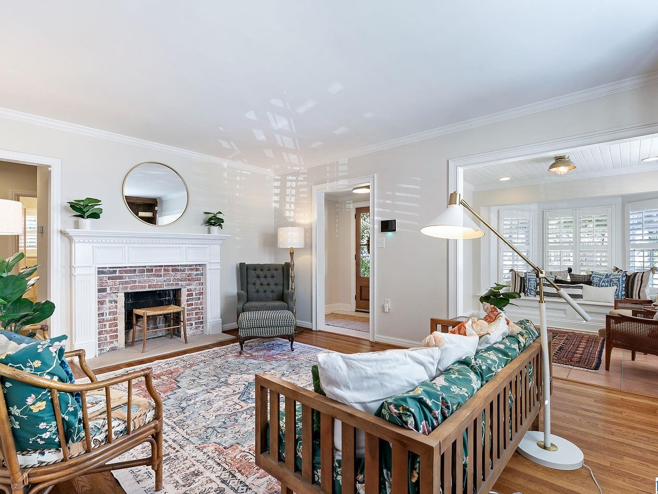 This cozy living room features natural wood flooring and a harmonious blend of textures. A floral-patterned sofa with inviting coral and white tones contrasts against a backdrop of soft, neutral walls. Rattan armchairs alongside a rich, patterned area rug add charm and comfort. The elegant brick fireplace serves as a focal point, bordered by a white mantel and adorned with greenery. A circular mirror reflects light, enhancing the space’s openness. A striped ottoman provides extra seating, while a modern floor lamp adds warmth. The overall aesthetic combines vintage influences with contemporary touches, creating an inviting atmosphere.