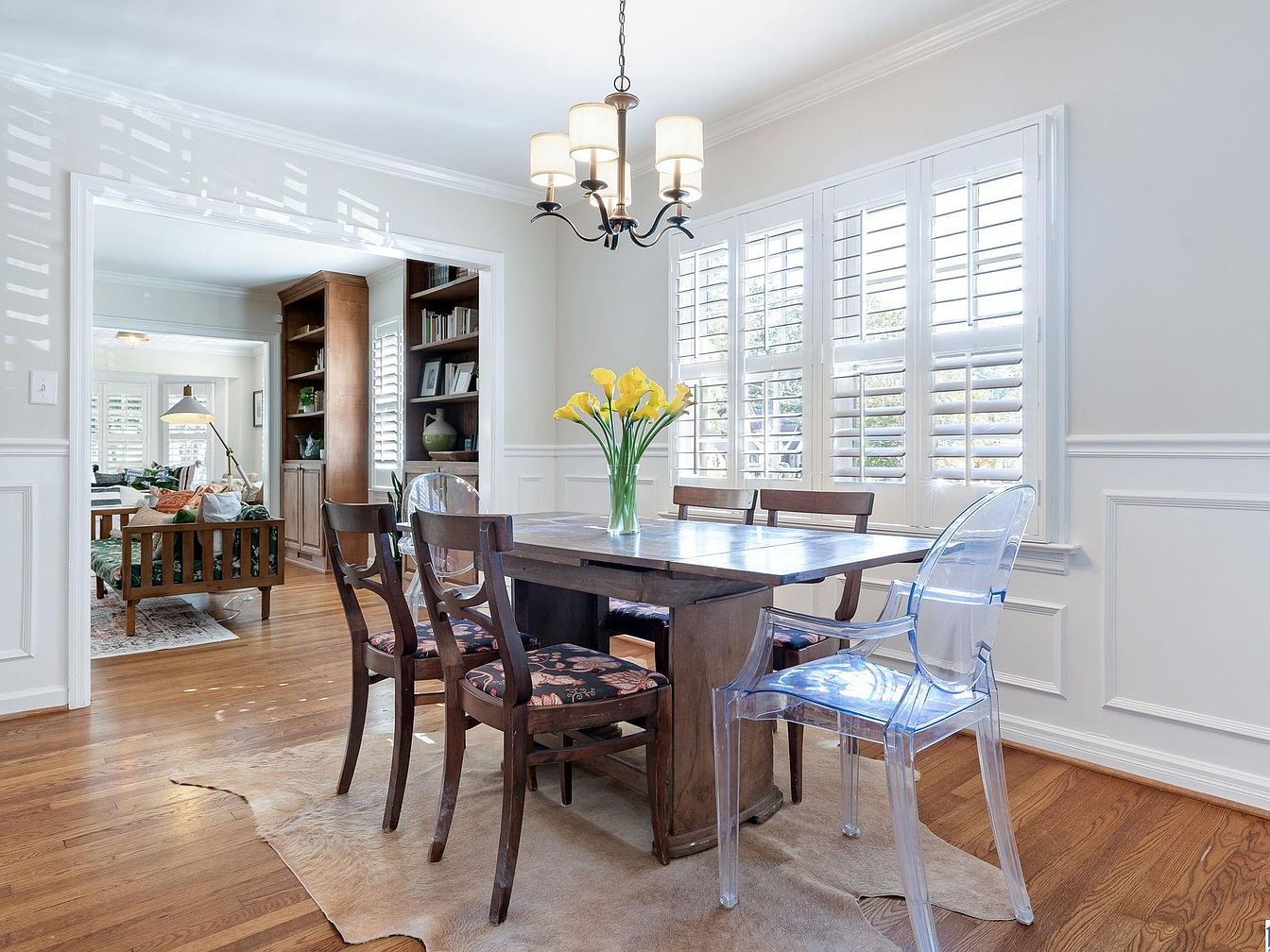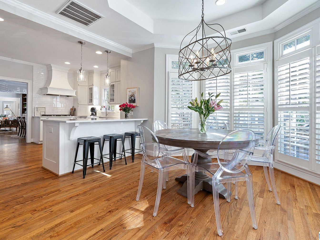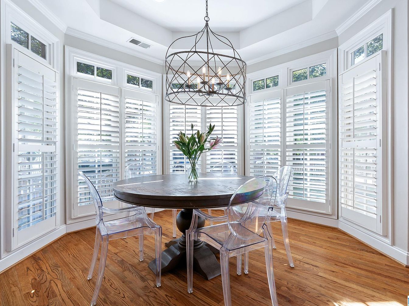 A cozy dining nook features a round wooden table centrally placed, accompanied by stylish clear acrylic chairs that add a modern touch. The room is illuminated by a striking geometric pendant light hanging from the ceiling. Natural light pours in through multiple bay windows adorned with white plantation shutters, highlighting the rich wooden flooring. Fresh flowers in a glass vase sit atop the table, providing a pop of life and color. The walls are painted a soft gray, enhancing the spacious feel while sophisticated crown molding emphasizes the architectural elegance of this inviting space.