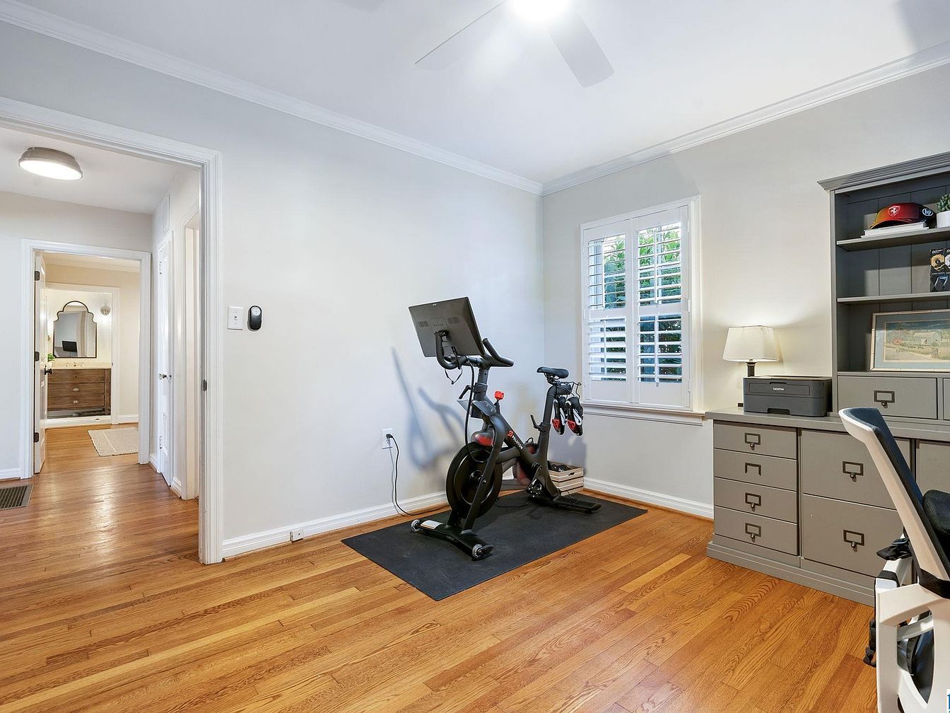 This home office features light gray walls that create a calm atmosphere, complemented by rich hardwood flooring. The room includes an exercise bicycle positioned on a black mat, promoting fitness within a workspace. A classic window with white shutters allows natural light to flood the room, enhanced by a soft lamp on a gray filing cabinet. Nearby, a doorway leads to an adjoining space that highlights a modern mirror and dresser, hinting at practical organization. Minimalist decor, clean lines, and functional furniture converge, illustrating a blend of productivity and tranquility in this inviting home environment.