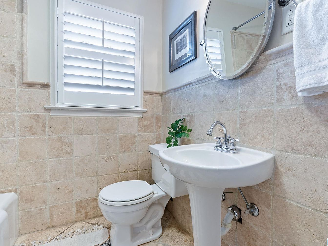 This compact bathroom features light-colored stone tiles that create a warm, inviting atmosphere. A circular mirror hangs above a white pedestal sink with chrome fixtures, complementing the classic aesthetic. The toilet is positioned adjacent to the sink, showing a simple yet functional layout. Natural light filters through a white-shuttered window, enhancing the airy feel. A small green plant adds a touch of freshness to the space. Soft beige tones dominate the walls and flooring, combined with elegant detailing along the tile edges, creating a serene and timeless environment.