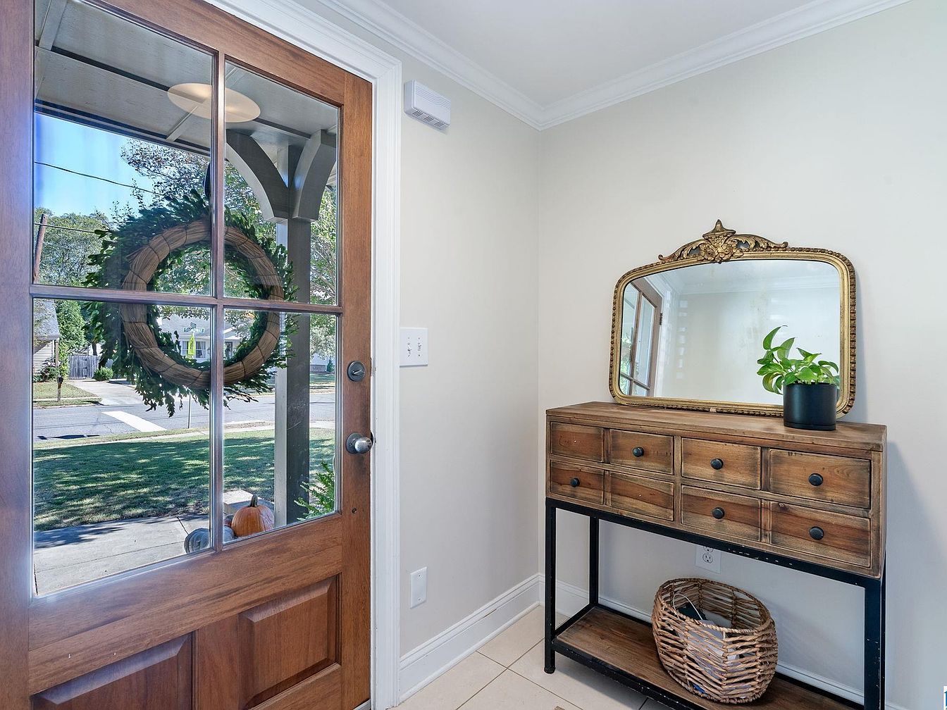 This entryway showcases a blend of rustic and classic design elements. A large wooden door with multiple glass panes allows natural light to flood the space, complemented by a circular green wreath on the door. The walls are painted a soft beige, enhancing the brightness. A narrow wooden console table sits against the wall, featuring several drawers with simple black knobs. Above it, an elegant, vintage-style mirror adds sophistication, framed in ornate gold. A small potted plant on the table introduces a touch of greenery, while a woven basket beneath provides additional storage, enhancing the overall inviting atmosphere.