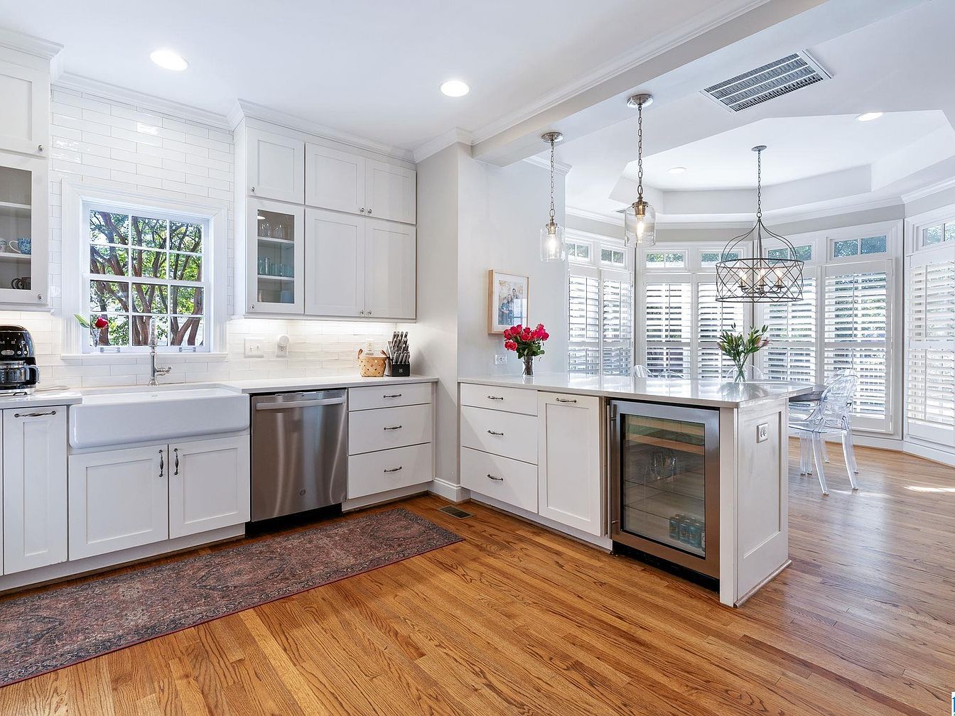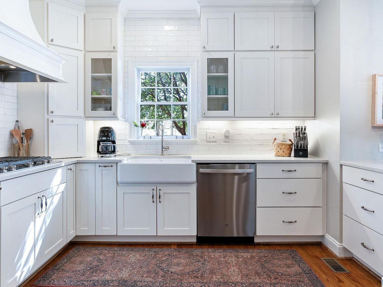 This kitchen features a modern yet classic design, characterized by white cabinetry and sleek countertops. The layout includes a farmhouse sink centrally located beneath a window, allowing natural light to brighten the space. A patterned area rug adds warmth to the hardwood floor. The stainless steel appliances, including a dishwasher, seamlessly blend with the cabinetry. Glass-fronted cabinets showcase colorful dishware. Subtle recessed lighting highlights the backsplash, made of white subway tiles that enhance the room’s brightness. The overall aesthetic combines functionality with a timeless charm, making it an inviting gathering place.