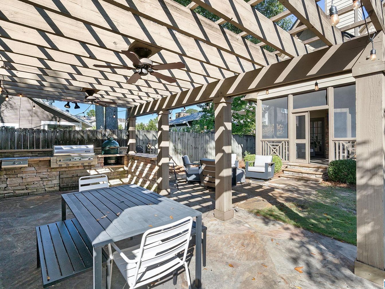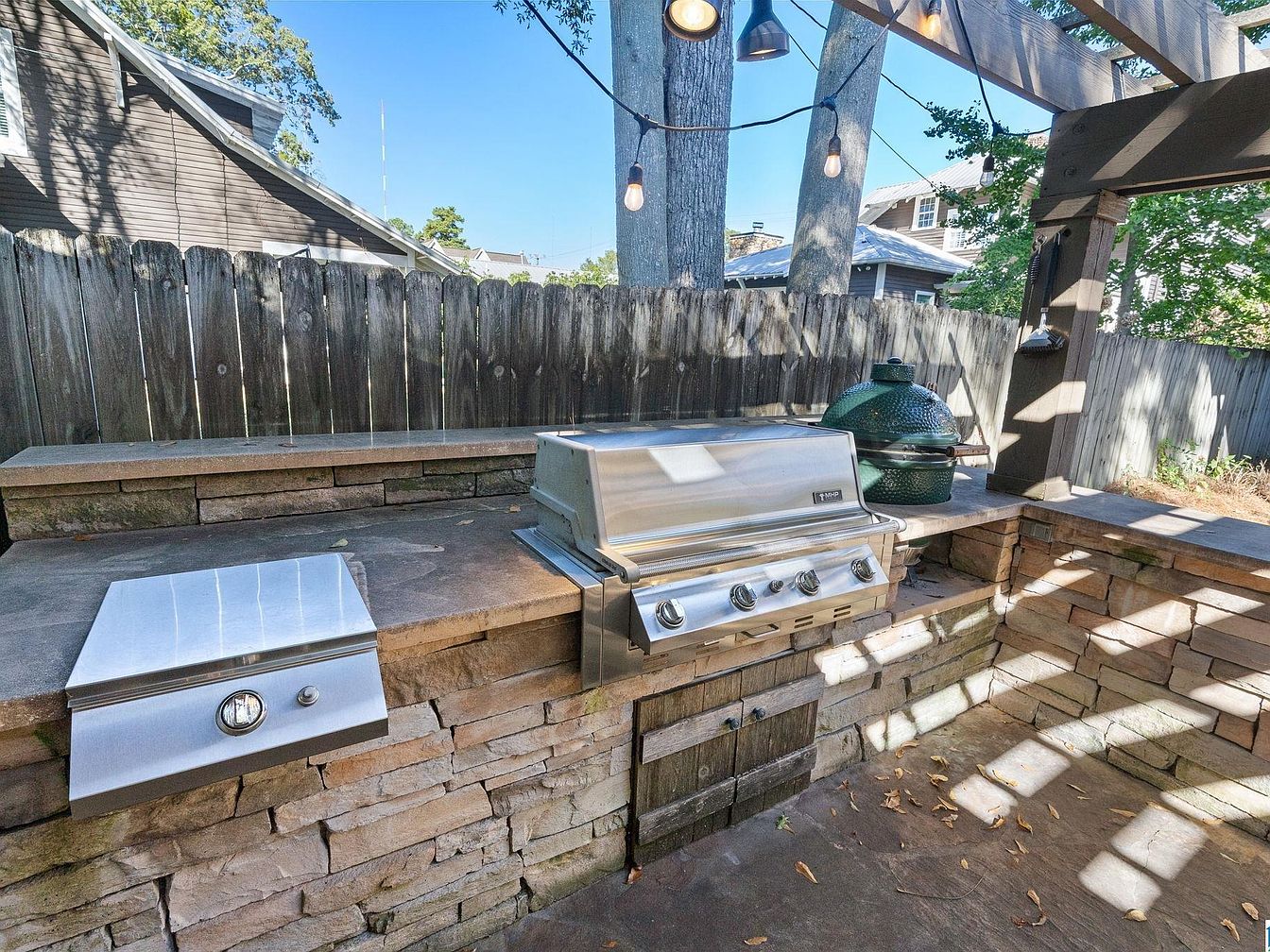 This outdoor kitchen space features a modern stainless steel grill prominently placed on a textured stone countertop. A secondary cooking unit is visible, enhancing the functionality of the area. The stone structure complements the natural surroundings, with wooden beams supporting a pergola above. Ambient lighting is created by exposed bulbs hanging from the beams, casting soft shadows on the polished stone surface. Sunlight streams in, highlighting the rich textures of the materials used. A rustic wooden fence encloses the area, creating a cozy, intimate atmosphere for outdoor cooking and entertaining, surrounded by trees and residential homes.