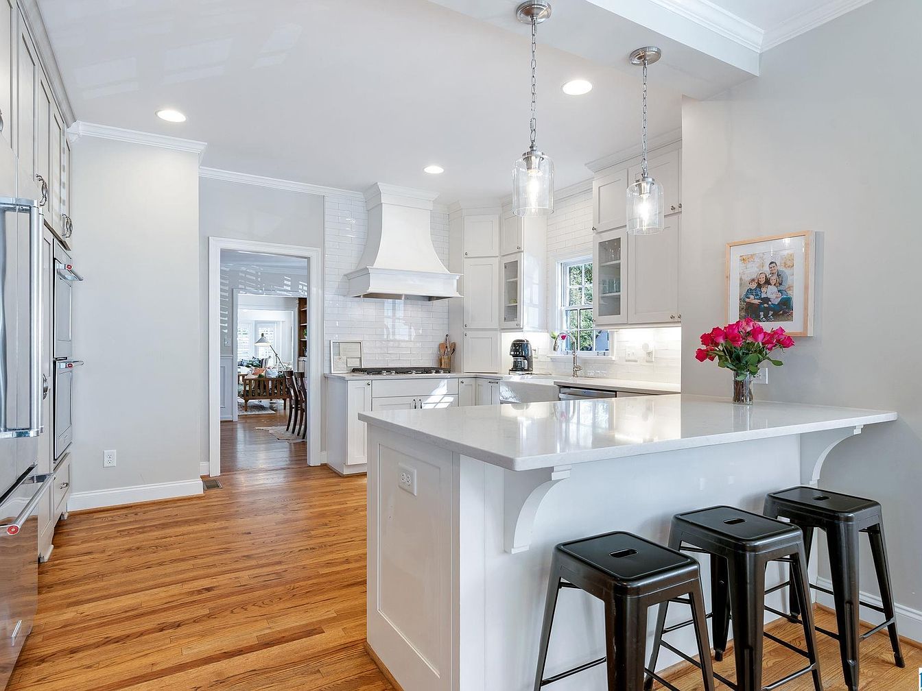 This modern kitchen showcases a harmonious blend of functionality and style. The layout features a central island topped with crisp white countertops, complemented by sleek black metal bar stools. Shaker-style cabinetry in soft gray creates a soothing aesthetic, with brushed nickel hardware enhancing the contemporary feel. A classic white tile backsplash and an elegant hood vent draw the eye upward, highlighting the high ceilings. Ample natural light streams through windows, illuminating the warm, polished hardwood floors. The adjacent doorway hints at a welcoming dining area, adding to the open, inviting ambiance of the space.