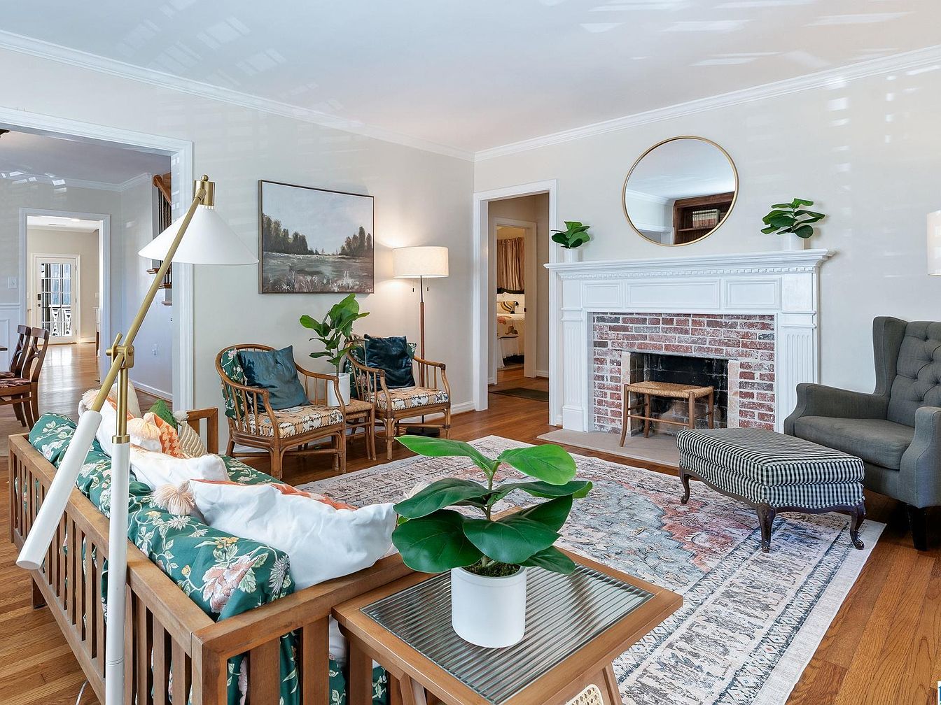 A spacious living room featuring a blend of traditional and contemporary aesthetics. The room showcases a light color palette with soft, beige walls complementing the warm tones of hardwood flooring. A classic brick fireplace serves as a central focal point, adorned with a sleek white mantel and a round mirror above it. Comfortable seating includes a green velvet tufted armchair and a wooden-framed sofa with a vibrant floral cushion. Decorative elements like potted plants add a touch of nature, while strategically placed lamps illuminate the space, enhancing the inviting and cozy atmosphere. Sunlight filters through plantation shutters, casting soft shadows.
