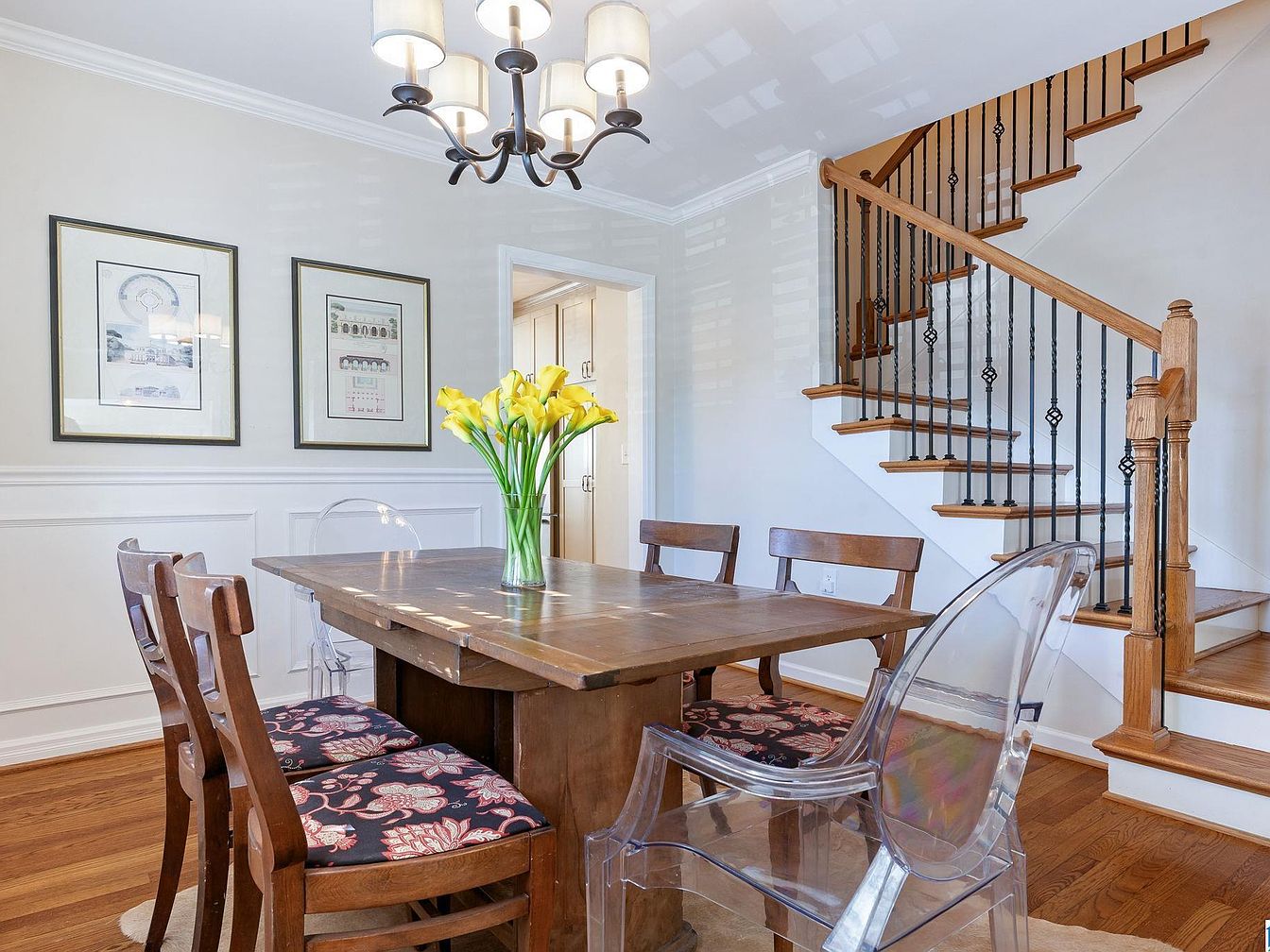 This dining area showcases a blend of traditional and modern aesthetics. A sturdy wooden table anchors the space, surrounded by a mix of dark wooden and transparent acrylic chairs, adding a contemporary touch. The chair cushions feature an intricate floral pattern in deep red and cream, contrasting beautifully with the dark wood. Bright yellow calla lilies in a clear vase serve as a vibrant centerpiece. The soft, muted wall color enhances the warmth of the hardwood flooring, while framed architectural prints adorn the walls, providing a historical reference. A stylish chandelier casts a welcoming glow, adding elegance to the atmosphere.