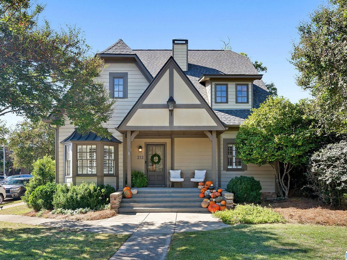 This front porch features a charming combination of architectural elements. The inviting entrance is enhanced by a gabled roof supported by decorative brackets. A stone-faced step leads to the path adorned with an array of pumpkins, emphasizing a seasonal flair. The color scheme consists of soft shades of beige with dark gray trim, creating a warm and welcoming vibe. Flanking the entrance, stylish chairs provide a cozy seating area, while strategically placed greenery and shrubs add a touch of nature, harmonizing with the overall aesthetic and enhancing the home’s curb appeal.