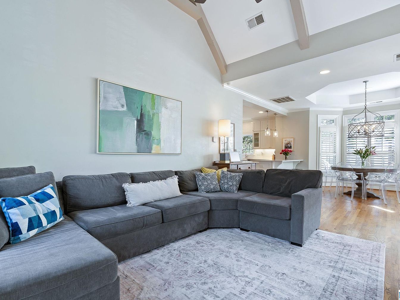 A spacious living room with a modern yet cozy vibe features a charcoal sectional sofa adorned with colorful throw pillows that add a pop of color. The light walls and high, vaulted ceiling enhance the airy atmosphere, contrasted by rustic wooden beams. A soft, neutral area rug grounds the seating area. To the left, an abstract painting brings artistic flair, while a sleek floor lamp provides ambient light. In the background, large windows with plantation shutters reveal glimpses of the adjoining dining area, where a contemporary round table stands, showcasing inviting floral arrangements and transparent chairs.