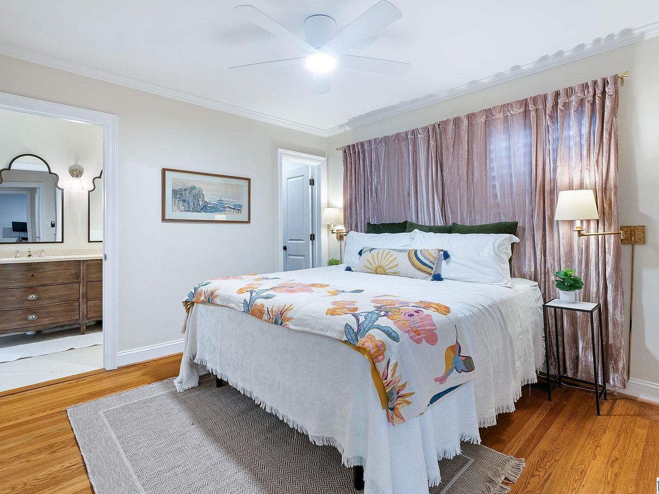 A cozy bedroom showcases a blend of modern and traditional aesthetics. The centerpiece is a plush bed adorned with a floral-patterned throw, complemented by cushy pillows in shades of white and deep green. Soft, sheer curtains in pale pink drape beside the window, adding warmth and texture. A sleek black side table with a small plant sits next to the bed, while a classic lamp provides gentle illumination. Light hardwood flooring contrasts with a textured area rug, enhancing the space’s inviting atmosphere. The ensuite bathroom doorway is subtly visible, framed by an elegant archway and featuring a dark wood vanity.