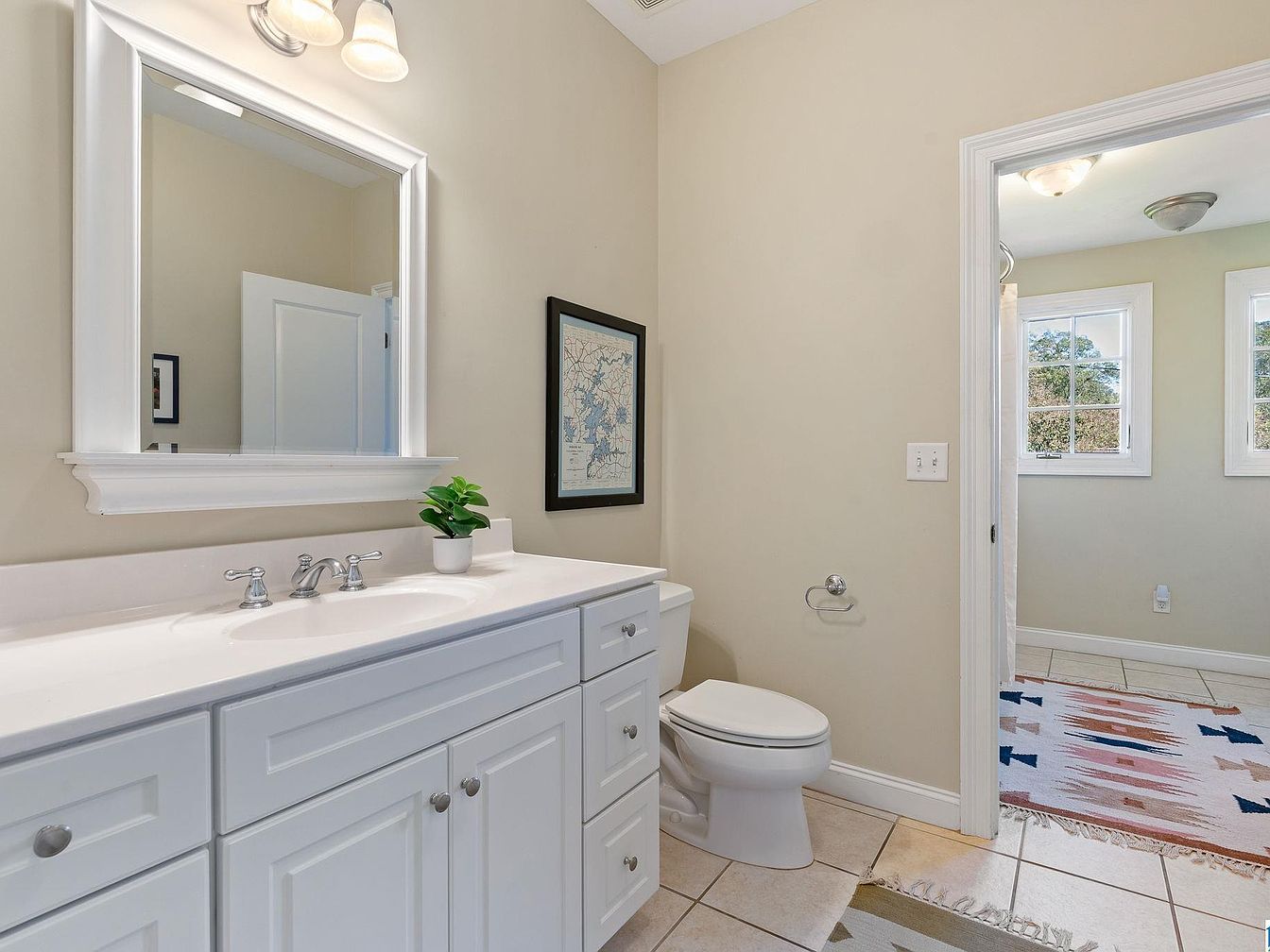 This bathroom features a bright and airy layout with neutral beige walls that create a warm atmosphere. A white vanity with sleek cabinetry is complemented by a clean, white countertop, providing ample space for toiletries. Above the sink hangs a large, framed mirror reflecting light, enhancing the room’s brightness. To the right, a classic toilet is positioned for efficient use of space, while a subtle green plant adds a touch of nature. Large windows invite natural light, illuminating the tiled floor. Colorful area rugs infused with vibrant patterns add character without overwhelming the serene setting.