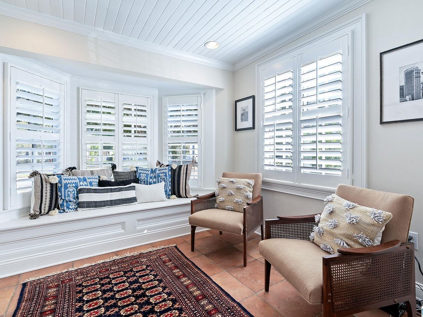 A cozy sunroom filled with natural light, featuring large windows adorned with white shutters. A built-in window seat showcasing a variety of decorative pillows in blue and neutral tones invites relaxation. Two mid-century style armchairs, upholstered in soft beige fabric, complement the space. A richly patterned area rug in deep red and navy adds warmth and character to the terracotta tiled floor. The ceiling with subtle blue paint enhances the airy atmosphere, while black and white framed artwork contributes a touch of style. This room masterfully blends comfort and aesthetics, creating a perfect spot for leisure.