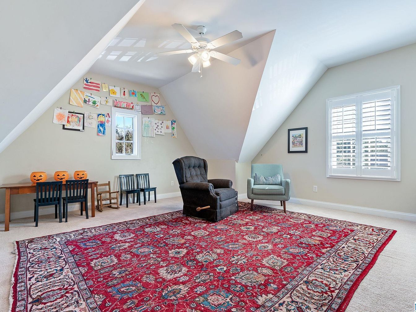 This attic area features an inviting and cozy ambiance, characterized by pitched ceilings and soft lighting. A vibrant, traditional Persian rug anchors the floor, contrasting with the light cream carpet. To one side, a dark recliner and a pale green accent chair provide comfortable seating, while a wooden table with playful pumpkin decorations sits opposite, accompanied by child-sized chairs showcasing a simple design. The walls display colorful children’s artwork, adding a personal touch. Natural light streams in through a window with plantation shutters, enhancing the airy feel of this charming playroom or relaxation space.