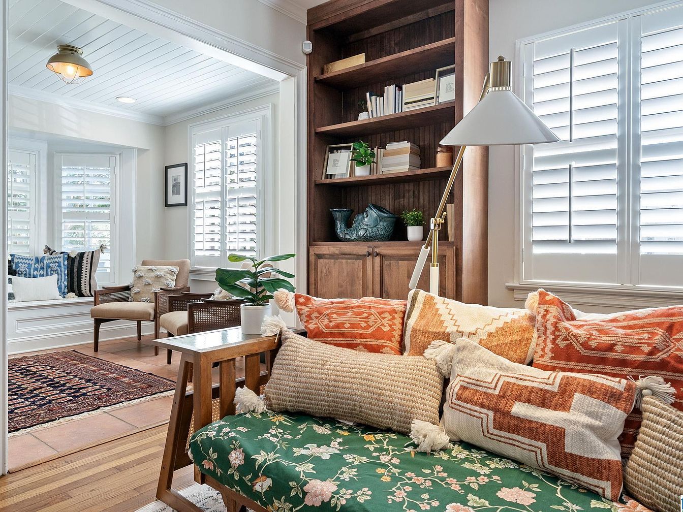 The space features a cozy living room layout with a striking green floral-patterned loveseat adorned with various decorative pillows, showcasing rich textures and earthy tones. Adjacent is a small wooden side table, ideal for resting beverages. A gentle light fixture hangs from the white, paneled ceiling, enhancing the inviting atmosphere. On one side, built-in shelves elegantly display books and decorative items, adding character and warmth. Shutters cover the windows, providing privacy and controlled lighting. A plush, patterned rug adds visual interest underfoot, while two accent chairs create a charming reading nook by the window.