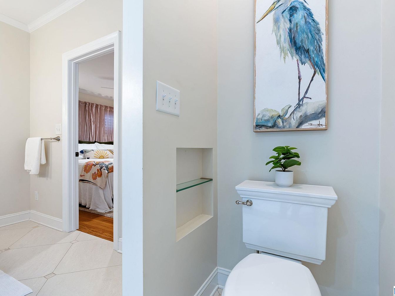 This bathroom features a serene layout with soft beige walls that enhance the calming atmosphere. A sleek white toilet is positioned to the right, alongside a small potted plant on a shelf, adding a touch of greenery. The flooring consists of light-colored hexagonal tiles, providing a modern contrast. Adjacent to the toilet, a towel bar displays a neatly hung white towel, emphasizing cleanliness. A doorway leads to a bedroom, visible in the background with a glimpse of elegant drapery and a floral bedspread, suggesting a cohesive design throughout. A vibrant artwork of a blue heron adorns one wall, adding a pop of color.