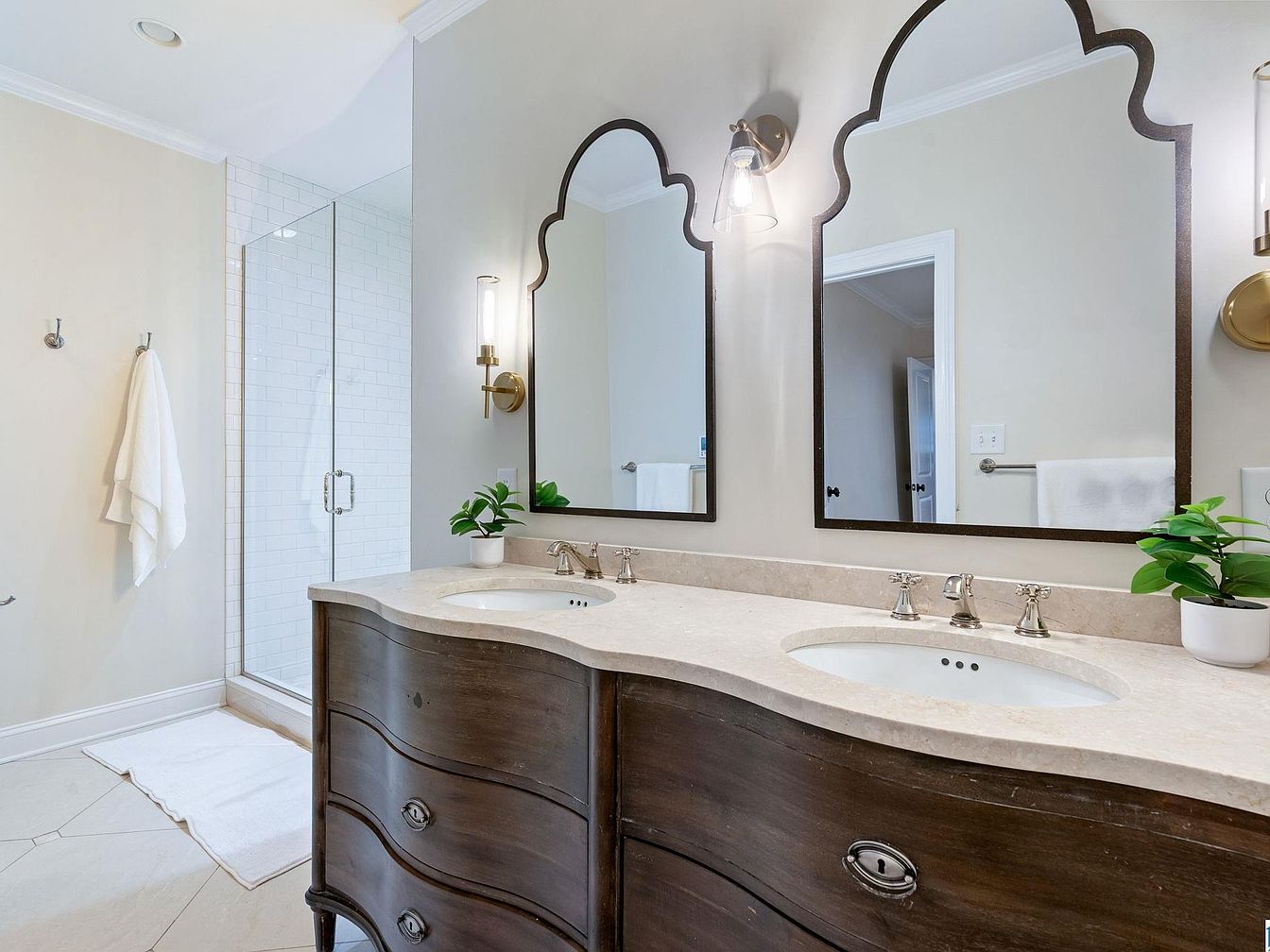 This elegant bathroom features a dual vanity with a curved wooden base, showcasing rich, dark tones that contrast beautifully with the light-colored stone countertop. Above the sinks, two ornate mirrors with arching tops reflect soft lighting from modern sconces. A glass-enclosed shower displays classic white subway tiles, enhancing the sleek design. The neutral paint color adds warmth, complemented by a tasteful arrangement of greenery on the counter. White towels hang neatly from wall hooks, while a plush, white mat lies before the shower, ensuring comfort. The overall aesthetic blends classic elegance with contemporary elements seamlessly.