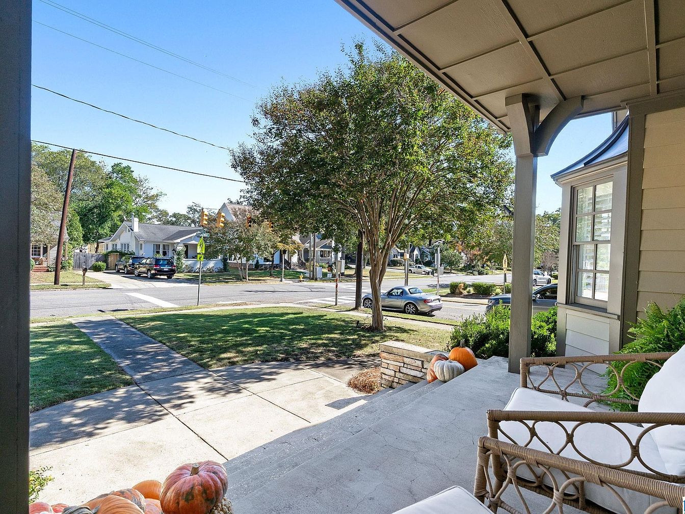 The front porch features a spacious layout with a smooth concrete surface and attractive railing. Light beige siding contrasts with darker gray structural elements. Comfortable outdoor seating in a woven design invites relaxation, adorned with plush white cushions. The view captures a tree-lined street, showcasing well-kept lawns and charming houses in the distance. Seasonal pumpkins decorate the edge of the porch, adding a fall touch. Lush greenery enhances the inviting atmosphere, while sunlight bathes the scene, creating a warm, welcoming environment perfect for enjoying morning coffee or evening conversations.