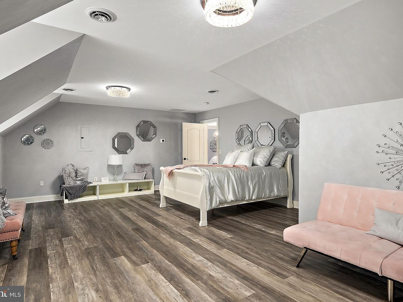 This tranquil bedroom features a sloped ceiling that adds charm and character. The walls are painted in soft gray, creating a calming atmosphere. A king-sized bed, adorned with silvery bedding, is the focal point. Opposite, a cozy pink loveseat adds a pop of color and invites relaxation. Geometric mirrors adorn one wall, reflecting light and enhancing the room’s spacious feel. Wooden laminate floors in a warm tone complement the décor. A minimalist shelf below the mirrors holds decorative items, maintaining a clean aesthetic. Elegant lighting fixtures contribute to the overall chic ambiance, making this space ideal for restful nights.