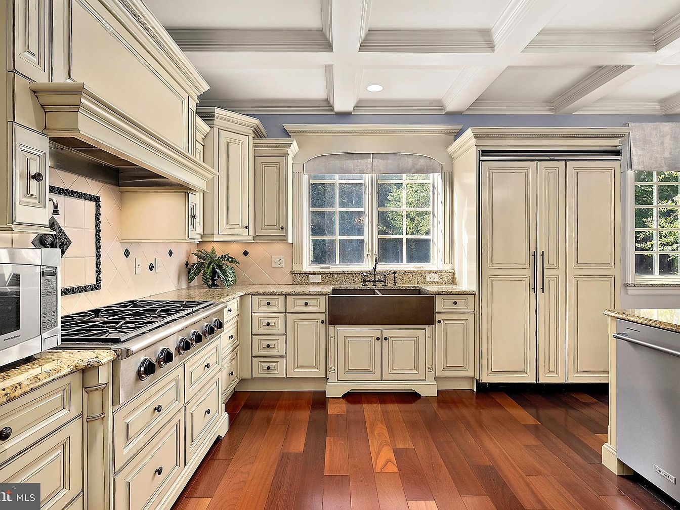 This kitchen showcases a classic and elegant design, emphasizing functionality and warmth. Cream-colored cabinetry with intricate moldings complements the rich, reddish hardwood floors. A large, farmhouse-style sink is centrally placed beneath a wide window, inviting natural light. The countertops are adorned with speckled granite, exuding luxury. A high-end gas range features multiple burners, catering to culinary enthusiasts. The cabinetry is thoughtfully designed with various compartments and stylish hardware. Soft blue tones on the upper walls contrast with the creamy cabinetry, creating a soothing ambiance. The coffered ceiling adds architectural interest, elevating the sophisticated atmosphere.