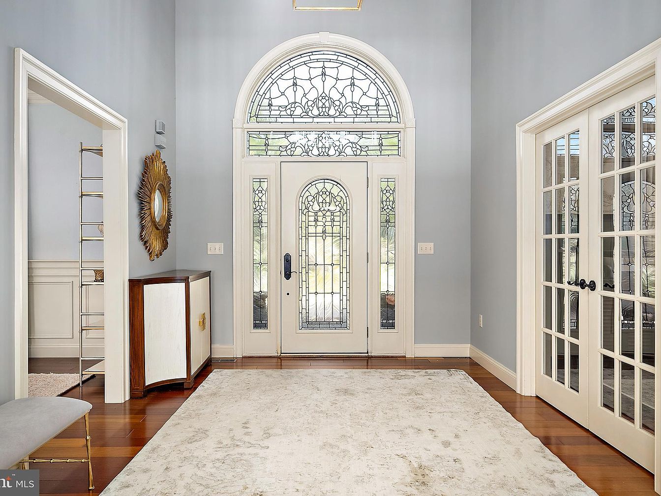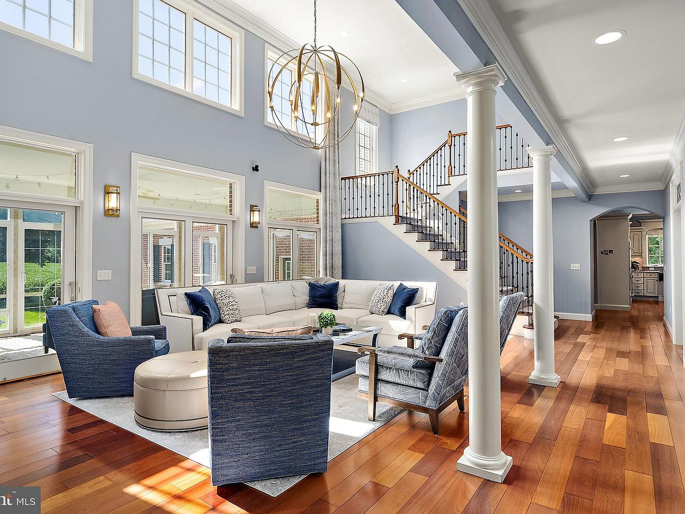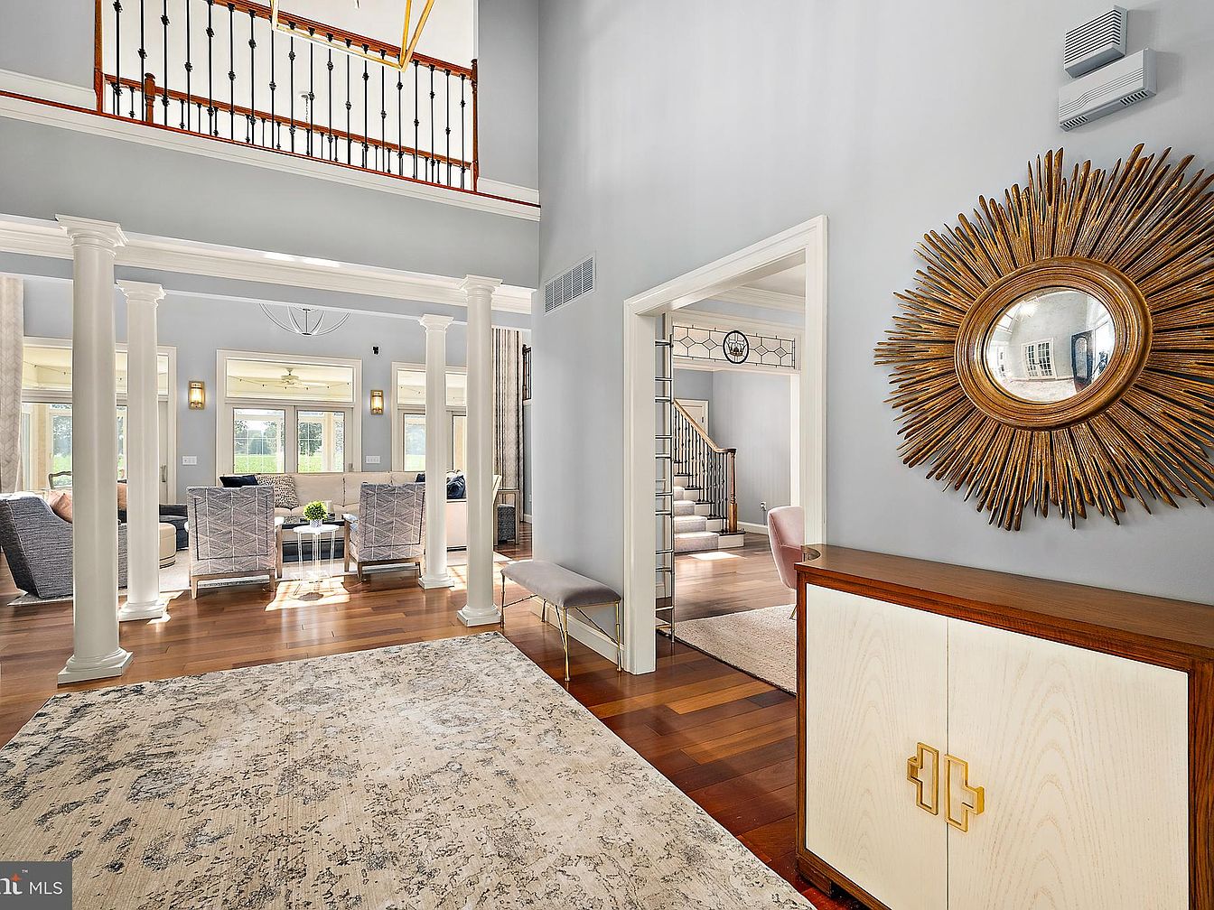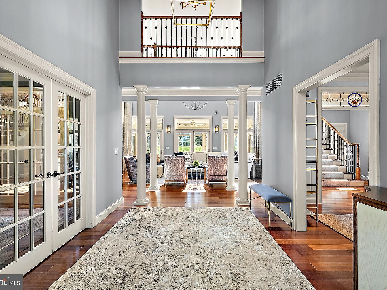 The space showcases a grand entry hall with a high ceiling and elegant architectural details. Soft blue walls contrast with rich wooden flooring, enhancing the room’s warmth. At the center, a beautiful area rug adds texture and comfort. Charming French doors lead to a sunlit living area, where plush seating arrangements create a welcoming atmosphere. Tall columns frame the passage, lending a classic touch. Natural light streams in through expansive windows, highlighting the tasteful decor, including stylish light fixtures and curated artwork. A staircase with polished wood railings ascends to the upper level, completing the sophisticated ambiance.