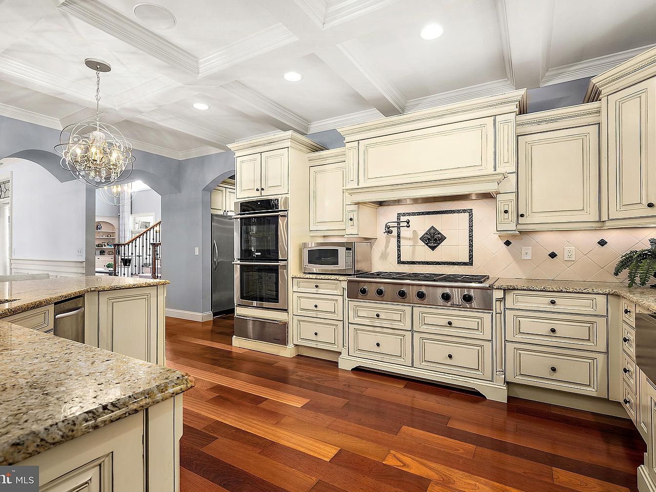 This kitchen features a spacious layout with rich, warm hardwood flooring that enhances its inviting ambiance. Cream-colored cabinetry with distinct paneling and antique-style hardware creates a classic yet modern feel. A large, granite countertop serves as a focal point, ideal for meal preparation and casual dining. Elegant light fixtures with a translucent, spherical design add sophistication and charm. The adjacent archway leads to another area of the home, promoting an open-concept atmosphere. Stainless steel appliances contrast beautifully against the soft color palette, while decorative tiles behind the stove add a touch of elegance.