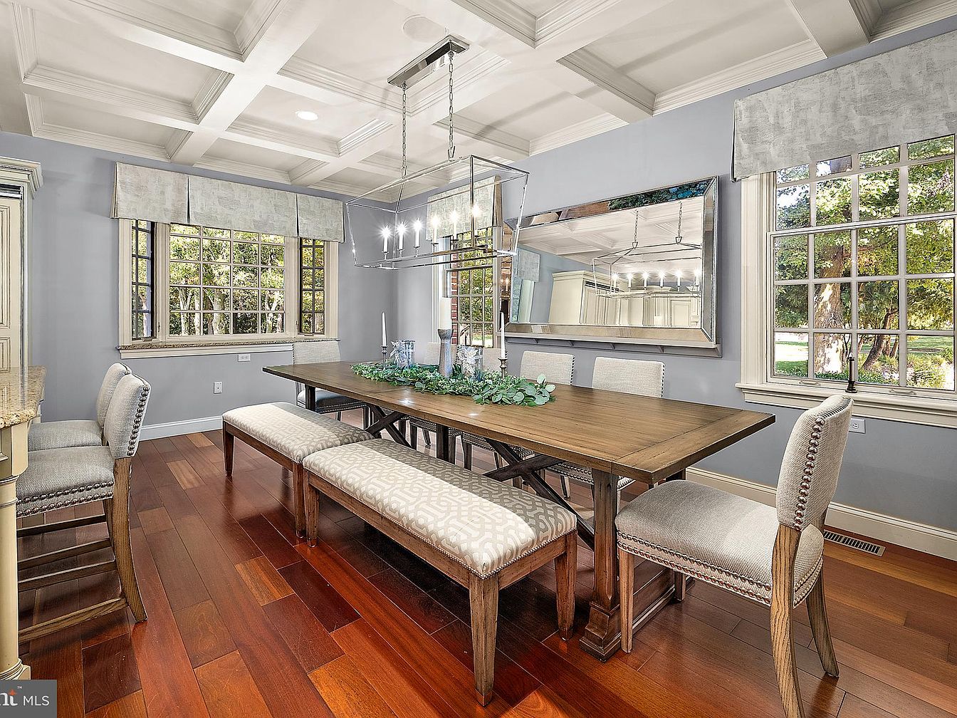 A spacious kitchen features a central island with a luxurious granite countertop, complemented by light-colored cabinetry with intricate detailing. The coffered ceiling enhances the room’s elegance, while polished wooden floors add warmth. Large windows allow natural light to flood the space, highlighting the soft blue walls and stylish window treatments. A farmhouse sink rests smoothly against the cabinetry, creating a practical yet aesthetic focal point. Nearby, a dining area showcases a sleek table and softly upholstered chairs, perfect for gatherings. Modern lighting fixtures, including a striking chandelier, offer a contemporary touch to the historically inspired design.