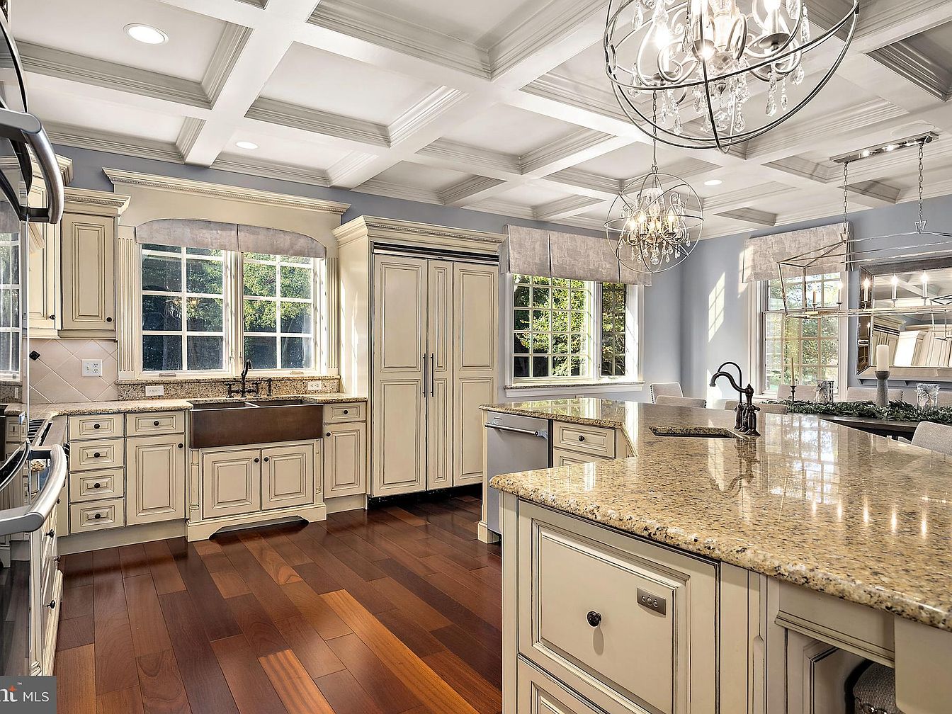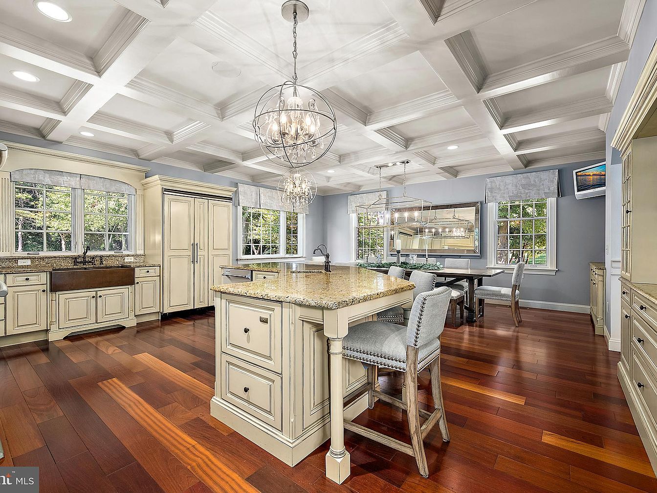 This spacious kitchen features a stunning arrangement of cream-colored cabinetry, complemented by intricate detailing. A large island with a golden speckled granite countertop occupies the center, enhancing both functionality and style. The cabinetry’s design incorporates raised paneling, enhancing the traditional aesthetic. Above, an elegant coffered ceiling draws the eye, while modern chandeliers add a contemporary touch. Natural light floods in through expansive windows dressed with soft gray curtains, illuminating the gleaming hardwood floors, which showcase rich dark tones. A farmhouse sink and stainless steel appliances integrate practicality within this inviting culinary space.