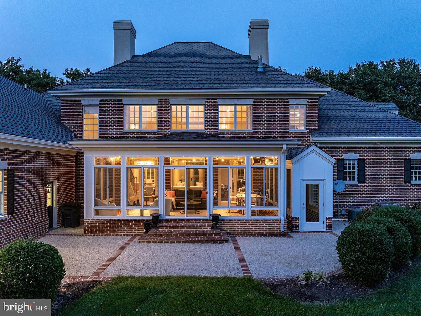 A spacious backyard showcases a thoughtfully designed exterior with a brick facade. The two-story house is accentuated with large, multi-paned windows that glow warmly, suggesting a lively interior. Features include a discreet entryway flanked by well-maintained hedges, adding greenery to the scene. The patio area is enhanced by a brick walkway leading towards the house, harmonizing with the gravel ground. The overall color palette blends earthy brick tones with white trim and dark shutters. Surrounding trees provide a natural backdrop, while the warm evening light creates an inviting atmosphere, perfect for relaxation or gatherings.