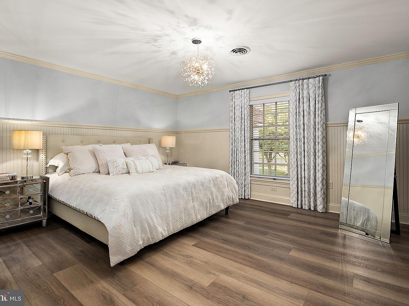 This elegant bedroom features a plush bed adorned with a textured, light-colored quilt and multiple decorative pillows. Soft beige walls are complemented by wainscoting, enhancing the room’s sophistication. A shimmering chandelier casts a warm glow, while two modern lamps flank the bed, providing ambient lighting. Floor-to-ceiling curtains in a geometric pattern frame the window, allowing natural light to filter through. A full-length mirror across from the bed enhances the sense of space, and the rich, wooden flooring adds warmth to the overall aesthetic, creating a tranquil and inviting retreat.