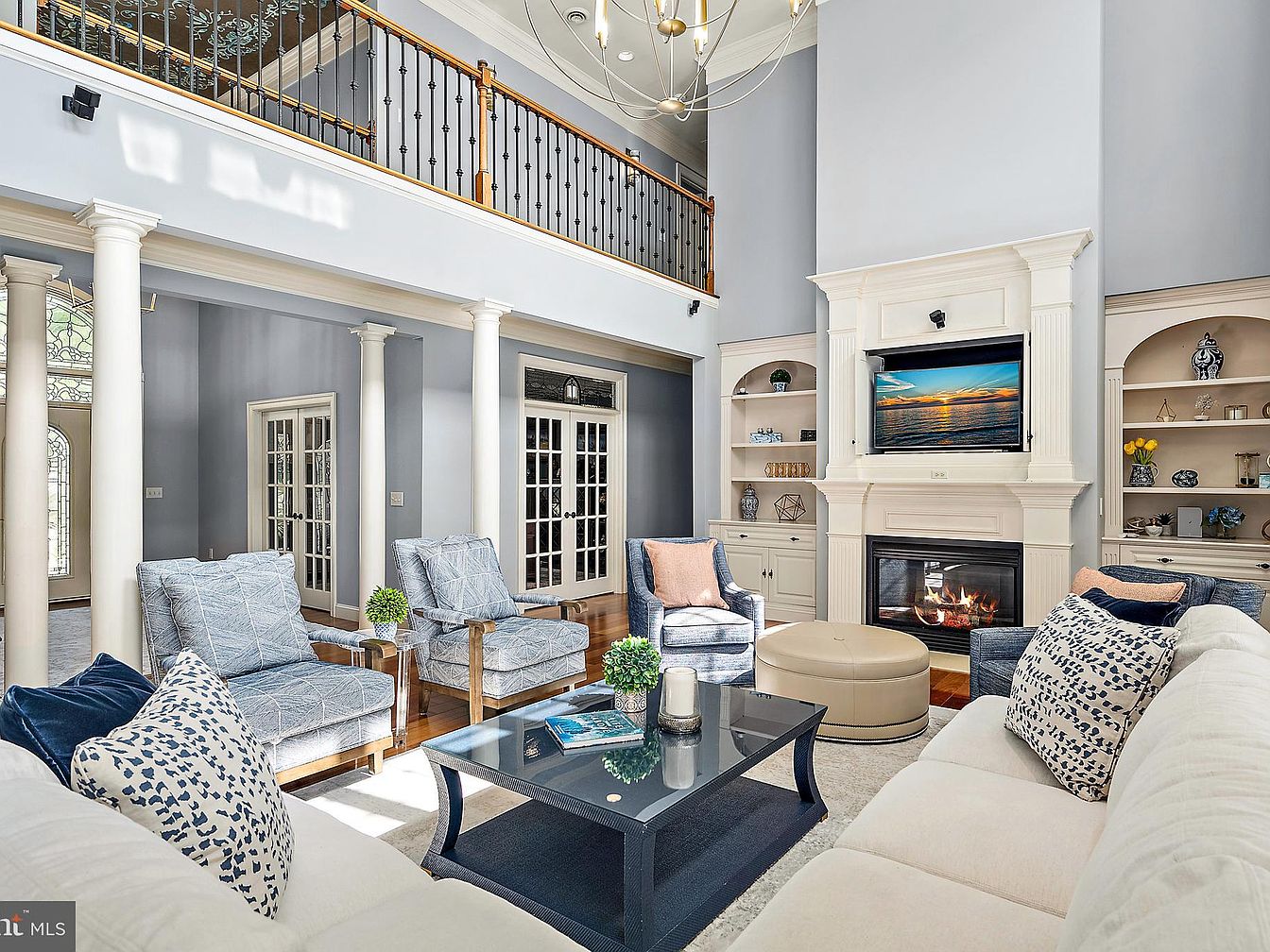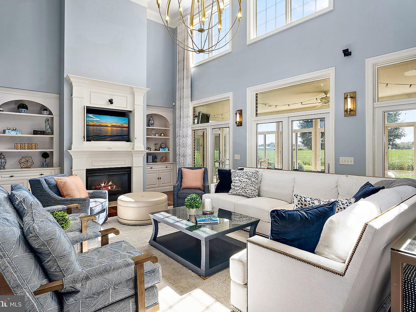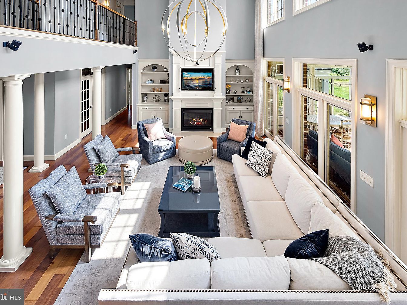 A spacious living room featuring a high ceiling with large windows allowing natural light to flood in. The walls are painted a soft blue, complementing the warm tones of the hardwood flooring. A large, comfortable sectional sofa occupies the center, adorned with patterned throw pillows. Opposite, two stylish armchairs echo the sofa’s color scheme, paired with small side tables. A sleek, dark coffee table anchors the seating area, topped with decorative accents. Above, a contemporary chandelier adds a modern touch. Built-in shelving flanks a traditional fireplace, showcasing both functionality and design.