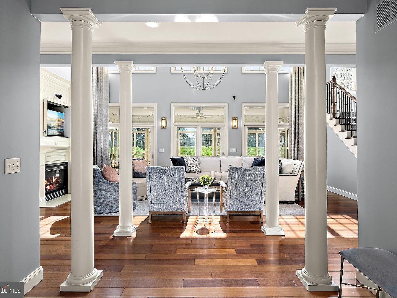 The living room showcases a harmonious blend of classic and modern design, highlighted by elegant white columns that frame the space. Soft gray walls provide a tranquil backdrop, while large windows flood the room with natural light. A plush seating arrangement features a light sofa adorned with pastel cushions, complemented by patterned accent chairs. The wooden floor adds warmth, contrasting beautifully with a sleek glass coffee table. A stone fireplace anchors the room, and modern light fixtures enhance the sophistication. Nearby, a graceful staircase with wrought iron details invites exploration, creating an inviting atmosphere.